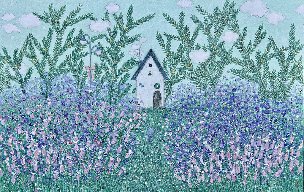 서소영 작가는 동화 속 배경처럼 활짝 핀 예쁜 꽃발 사이로 아름다운 집을 그렸다. 장지에 채색하여 은은하게 빛나는 풍경은 몽환적이면서도 한번은 거닐어 보고 싶었던 환상의 정원을 아름다운 이미지로 구현했다.