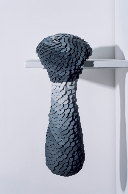 가마에서 구워진 스팽글은 백토와 흑토의 은은한 색감을 가지며, 직물 위에 배열된 후 손바느질을 통해 면에서 입체로 변형된다. 색의 농담과 스팽글의 중첩은 시각적 율동감을 만들어내며, 흘러내리는 듯한 비정형의 형태는 자아의 끊임없는 변화를 상기시킨다.