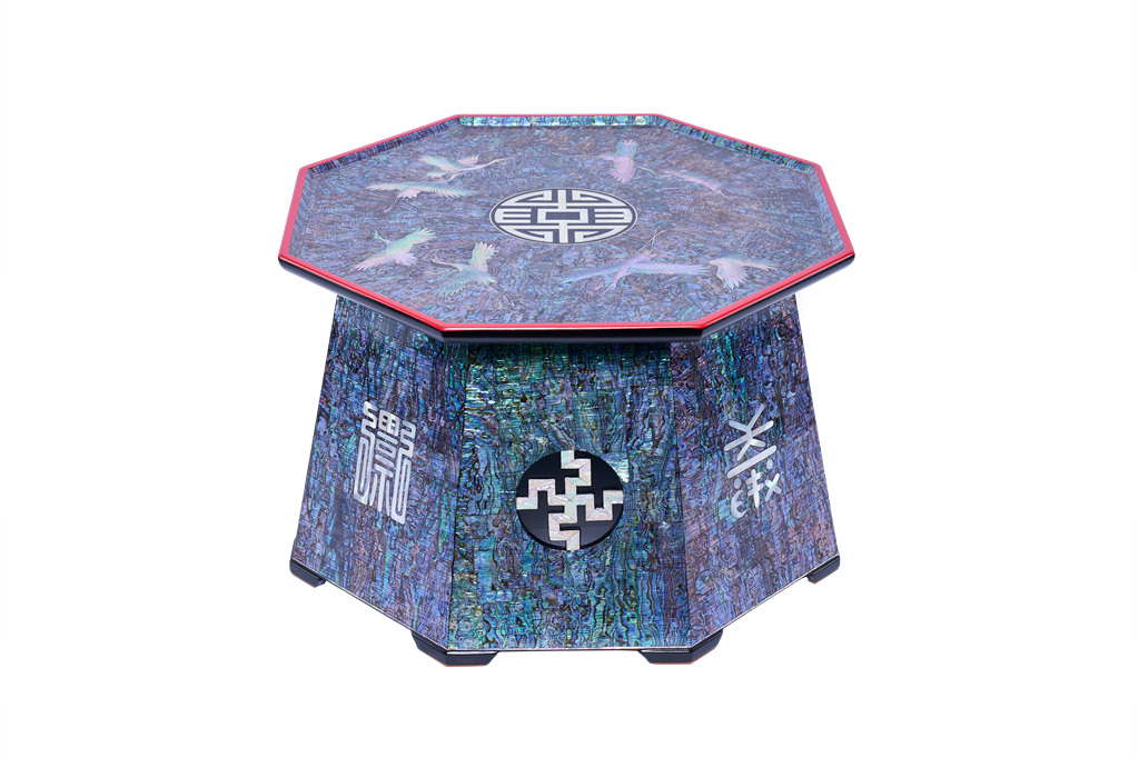 실생활에 사용할 수 있는 가구들이지만 하나의 완벽한 예술품처럼 자개에서 뿜어져 나오는 오묘하고 영롱한 빛이 시선을 머물게 하며, 둥근 상판 위에 촘촘히 박힌 자개 문양, 중심부의 화려한 원형 장식 등은 화려함의 극치를 보여주고 있다.