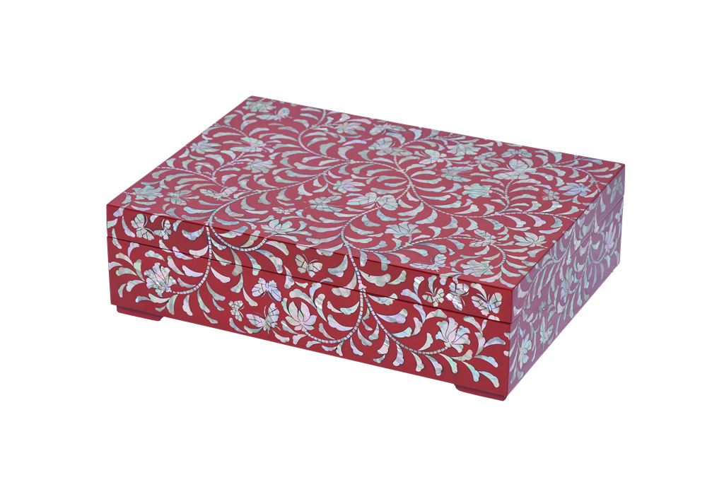 나전칠기는 전복, 진주조개, 소라 등의 껍질을 얇게 잘라서 나무나 옻칠한 바탕위에 붙이고 그 위에 다시 옻칠을 입혀 표면을 매끄럽게 만든 후 갈아내는 방식으로 작품이 완성되는데 총 165과정을 거쳐야 비로소 완성되는 귀한 공예품이다.
