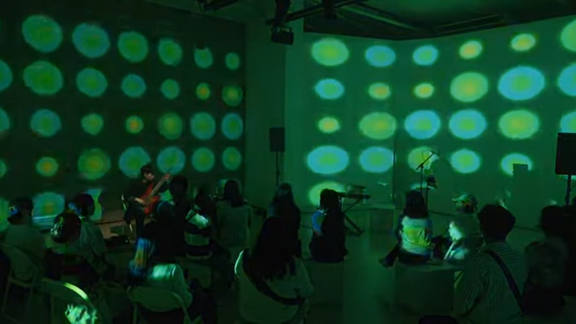 소리만으로 들었다면 이 느낌이 아니었을 것이, 관객들도 이 장소에 들어서면서 느꼈을 텐데, 사방 벽면 미디어아트 영상으로 가득 한국전통 오방색이 선명하게, 때로는 파스텔톤으로 응용되어 벽면을 통으로 채우기도 하고, 가로세로로 분할되고, 띠 모양, 격자모양으로 음악의 리듬에 맞추어 공간을 수 놓는데 음악과 기가막히게 잘 어울렸다는 점이다.