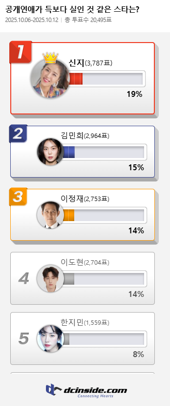 커뮤니티 포털사이트 디시인사이드(대표 김유식)가 `공개연애가 득보다 실인 것 같은 스타는?`으로 투표를 한 결과 신지가 1위에 올랐다. 이 투표는 지난 6일부터 12일까지 총 7일간 진행했다.