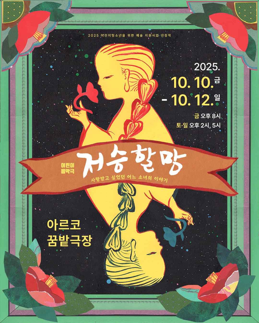 이야기기획단 시작과끝(대표 최은정)이 제작한 어린이음악극 '저승할망'이 지난 10월 10일부터 12일까지 3일간 아르코꿈밭극장에서 총 5회 공연을 성황리에 마쳤다. 싱어송라이터 안예은이 작곡하여 관심을 모았던 이번 공연은 2025 어린이·청소년을 위한 예술지원사업 선정작으로, 매 회차 100여 명의 관객을 맞이하며 뜨거운 호응을 얻었다.
