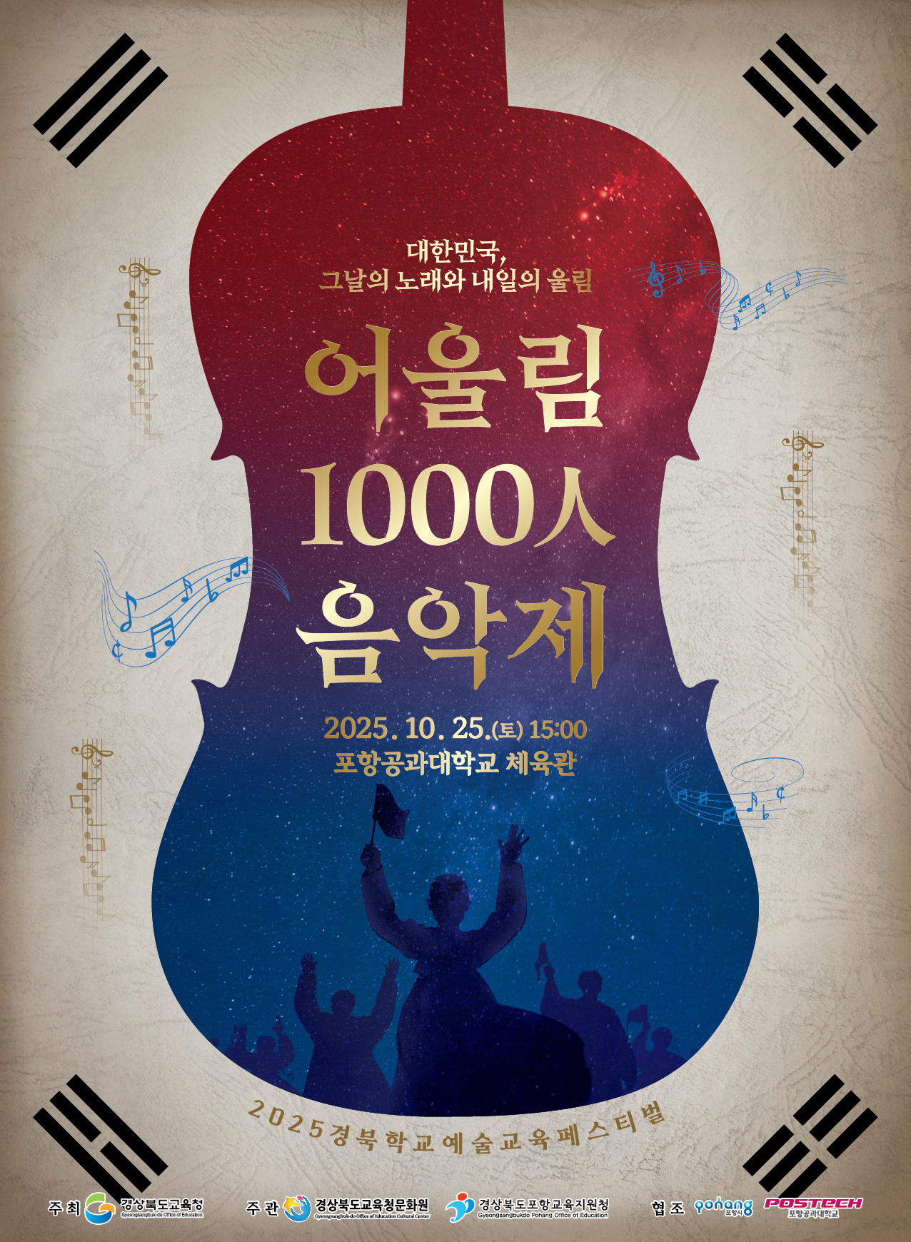 [플레이뉴스 문성식기자] 광복 80주년을 맞아 경북포항 학생, 음악인 1,000명이 모여 대한민국의 역사와 미래를 노래하는 대규모 예술교육 축제 ‘2025 어울림1000인음악제’가 10월 25일 포스텍 체육관에서 열린다.