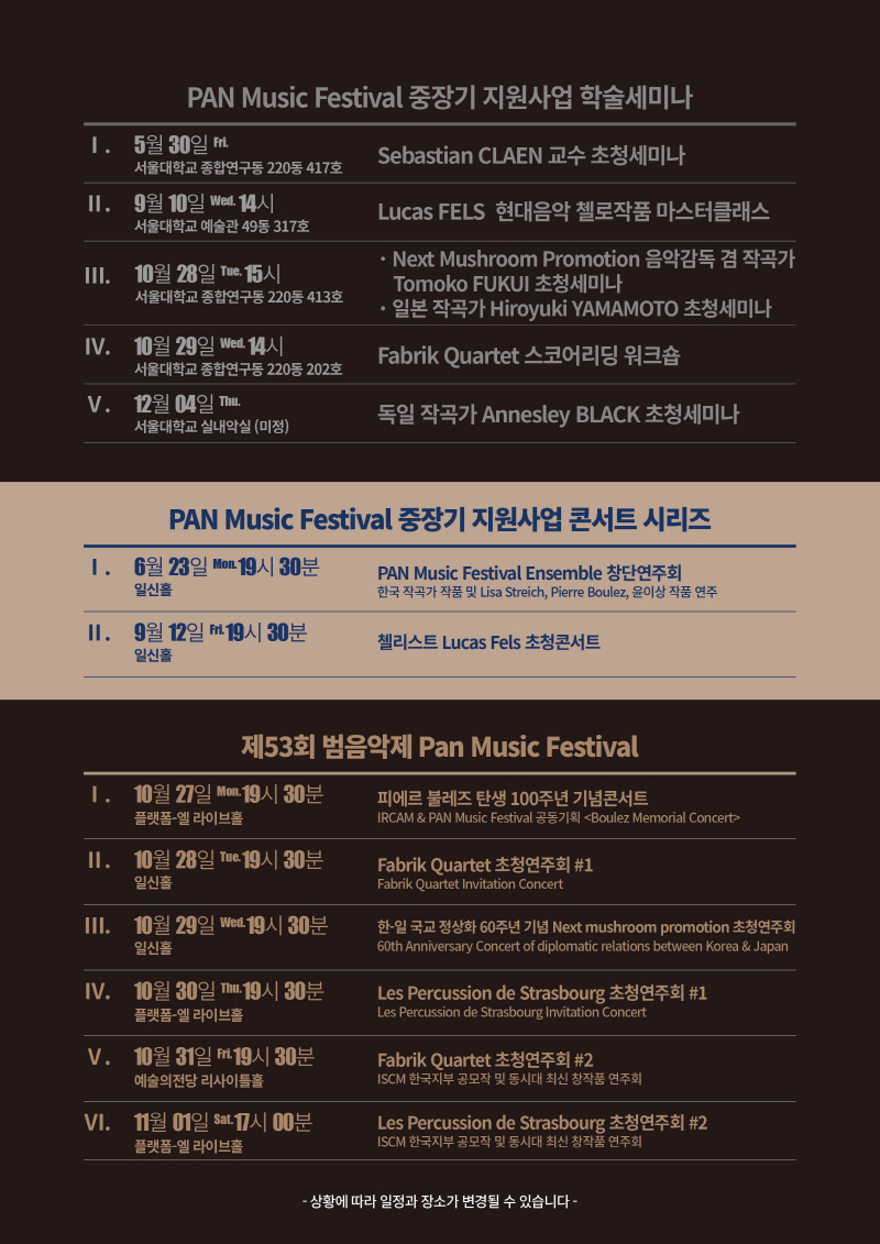 [플레이뉴스 박순영기자] 국제현대음악협회 한국위원회(ISCM Korea, 회장 임종우)는 돌아오는 10월 27일부터 11월 1일까지 제53회 범음악제(Pan Music Festival)를 개최한다. 특히 올해부터 한국문화예술위원회로부터 중장기 지원사업으로 선정되어 보다 안정적이고 알차게 운영할 토대를 마련하고 있다.