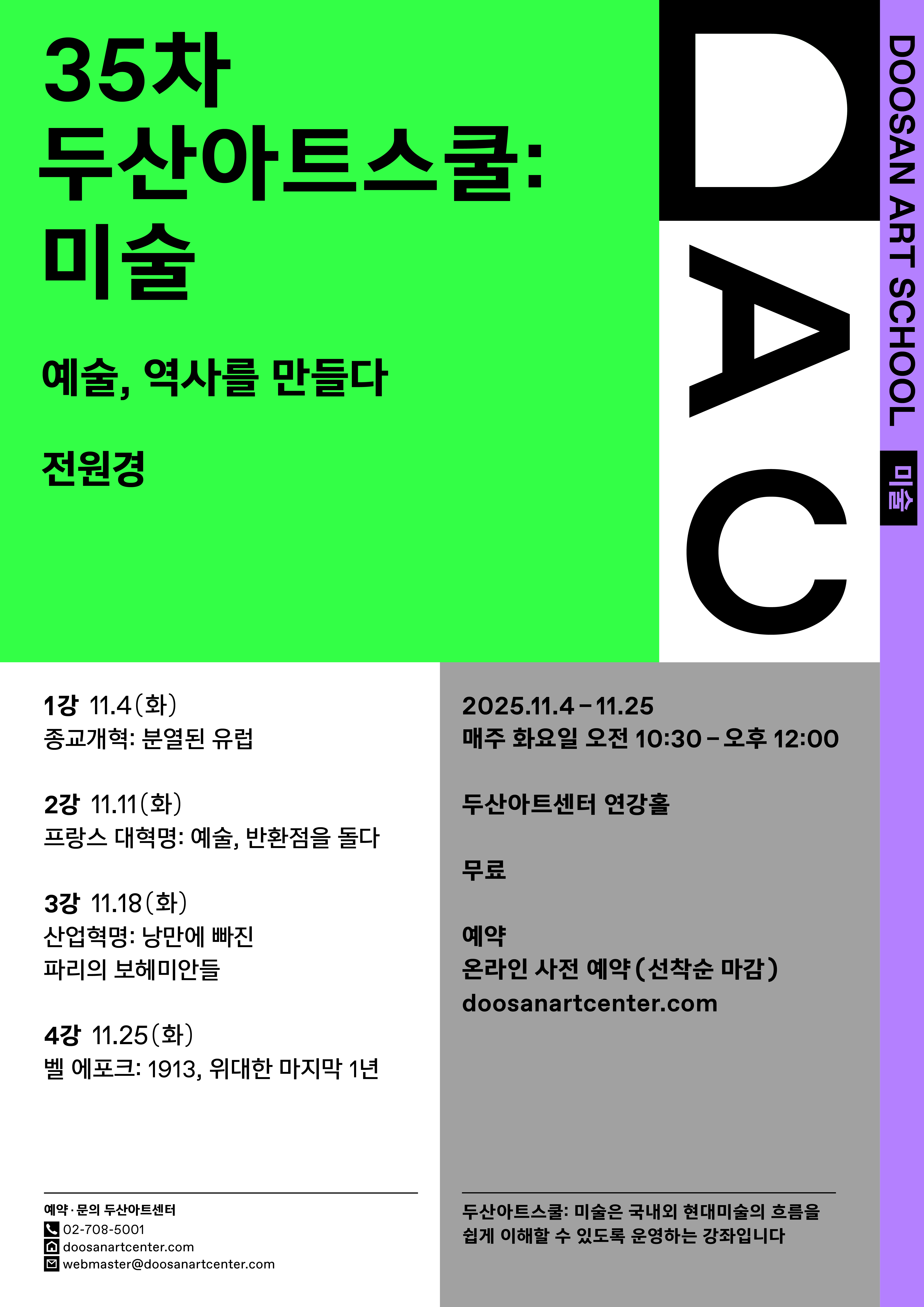 - ‘예술, 역사를 만들다’ 주제로, 11월 25일까지 두산아트센터 연강홀에서 무료 미술 강연 진행