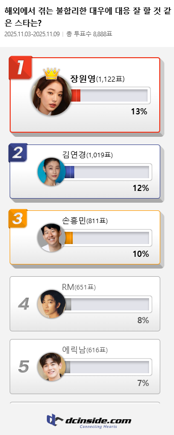 커뮤니티 포털사이트 디시인사이드(대표 김유식)가 `해외에서 겪는 불합리한 대우에 대응 잘 할 것 같은 스타는?`으로 투표를 한 결과 장원영이 1위에 올랐다. 이 투표는 지난 3일부터 9일까지 총 7일간 진행했다.