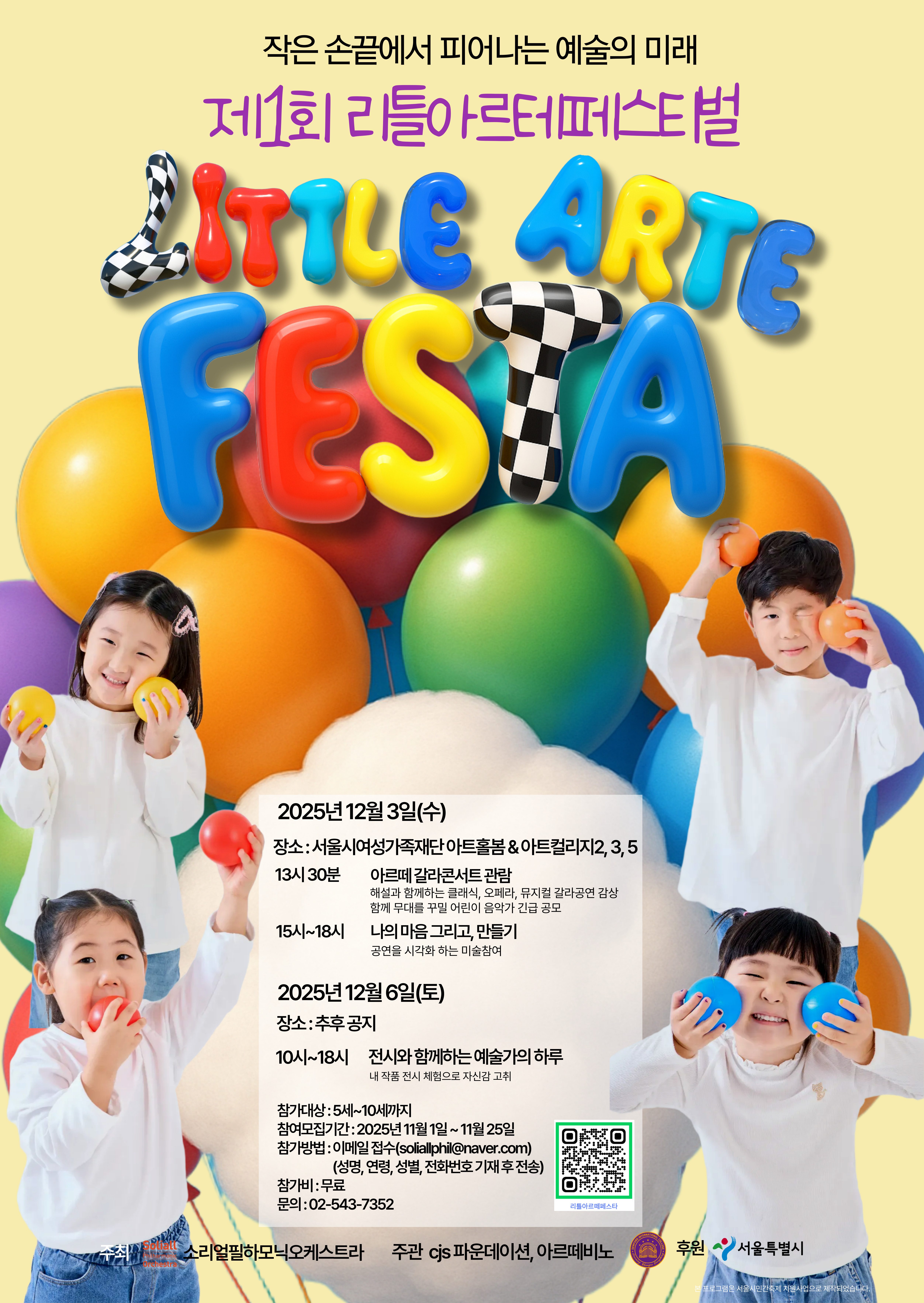 [플레이뉴스 문성식기자] 서울특별시의 후원으로 국내 최고 수준의 민간 오케스트라인 (사)소리얼필하모닉오케스트라(대표 김기웅)가 주최하고, CJS파운데이션과 아르떼비노가 주관하는 어린이 예술축제 ‘제1회 리틀 아르떼 페스타(Little Arte Festa)’가 오는 12월 3일(수), 서울 동작구에 위치한 서울시여성가족재단 아트홀 봄에서 열린다.