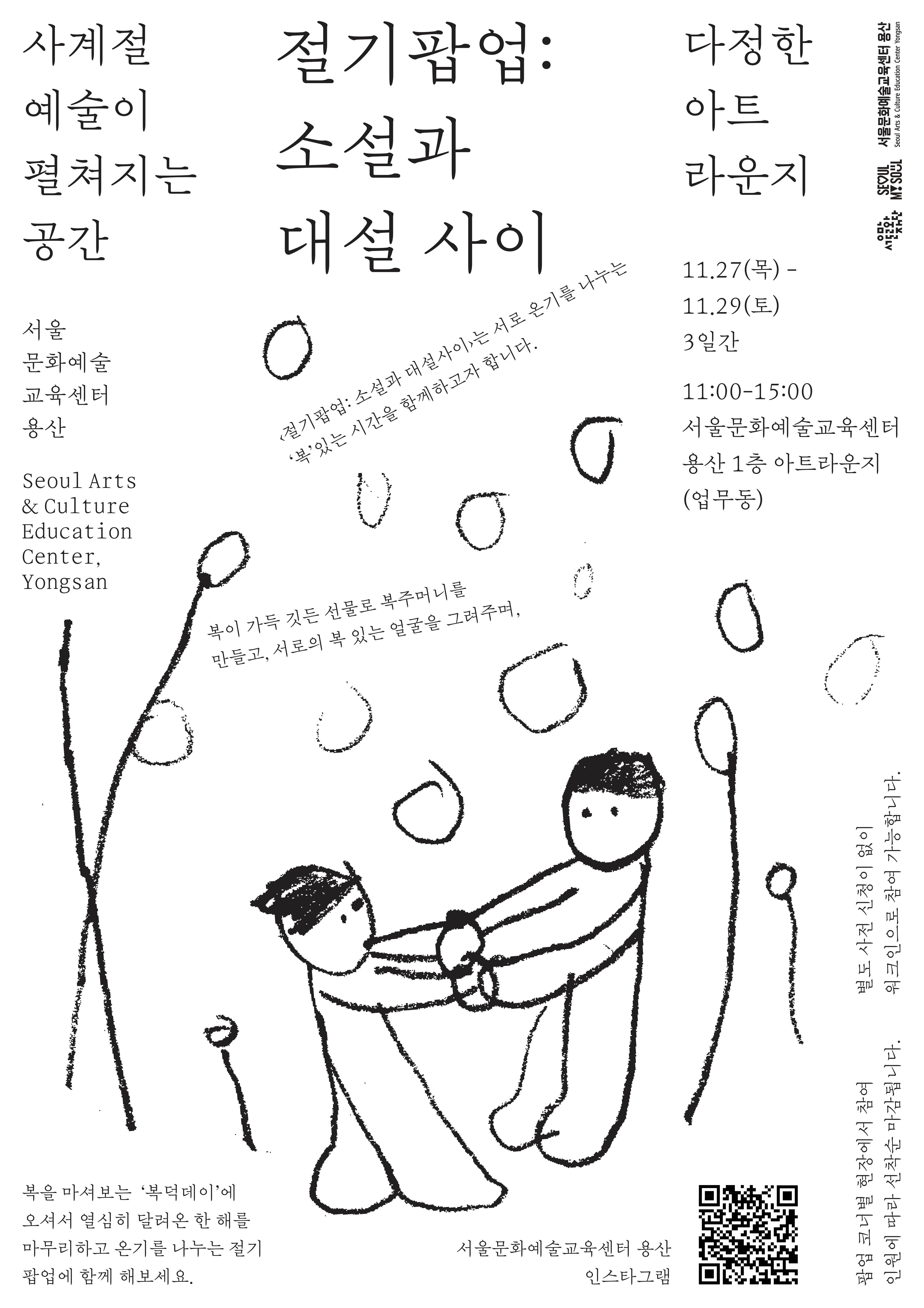 지난 봄 시즌의 '절기팝업: 입하와 소만 사이'에 이어, 이번 겨울 시즌에는 '절기팝업: 소설과 대설 사이'가 오는 27일(목)부터 사흘간 진행한다. 서로의 온기를 나누는 ‘복 주머니’를 콘셉트로 다양한 예술 체험 프로그램이 마련됐다.