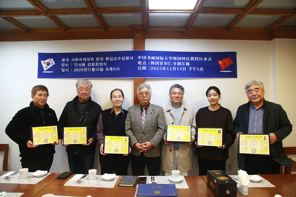 [플레이뉴스 문성식기자] 수묵산수 황영식 화백은 2022년 중국 서화국제대학 북경 본교에서 특임교수로 임명되었으며, 추천한 한국인 특임교수 7명도 2025년 11월 3일(월) 정식 임명되어 11월 13일(목) 17:00 서울 인사동 강호한정식에서 임명식을 갖고 동양 전통 예술인 서화를 발전시키기 위한 후학양성 교육을 더욱 활발히 추진하기로 했다.
