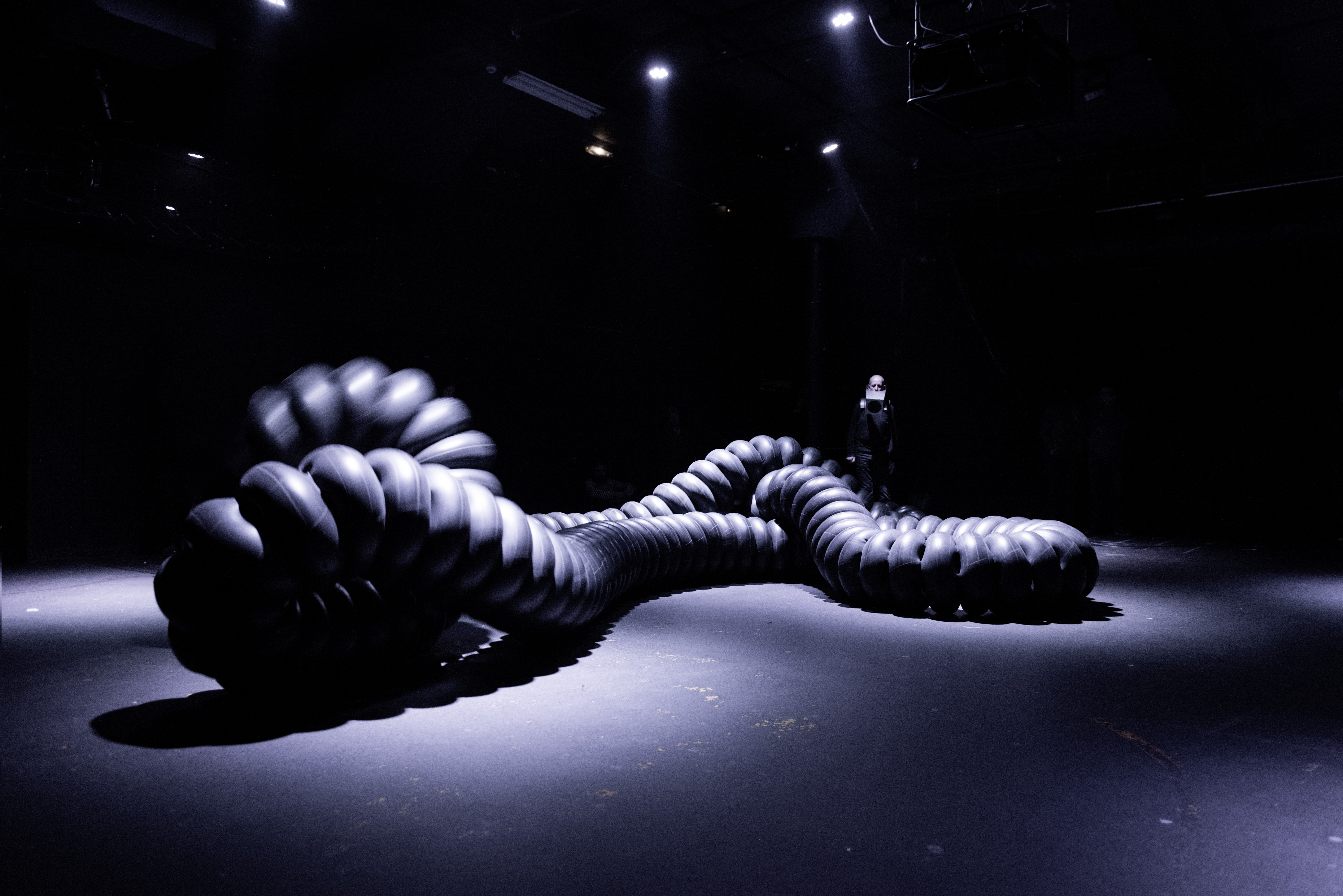 | Cod.Act - πTon | 스위스 예술가 Cod.Act의 대표작 《파이톤(πTon)》은 긴 금속 몸체가 몸을 비틀고 흔들며 스스로 소리를 만들어내는 ‘기계 생명체’ 같은 작품이다. 여러 개의 금속 관절로 이루어진 구조물이 알고리즘에 따라 예측할 수 없는 리듬으로 움직이며, 그 동작 자체가 하나의 음향과 퍼포먼스로 확장된다. 전시장에 들어서면 금속 구조물이 갑자기 숨 쉬듯 움직이며 낮은 울림과 진동을 만들어내고, 관람객은 이 파동이 공기와 바닥을 타고 몸에 스며드는 감각을 직접 경험하게 된다. 그 순간 관람객은 기계가 마치 “살아 있는 어떤 존재”처럼 느껴지는 특별한 순간을 마주하게 되며, 인간·기계·자연의 경계가 흐려지는 독특한 몰입 경험을 얻게 된다. |
