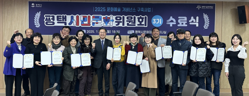 [플레이뉴스 문성식기자] 평택시문화재단(대표이사 이상균)은 11월 17일(월) 평택시문화재단 세미나실에서 ‘평택 시민문화위원회 3기 활동 종료 및 수료식’을 개최하고, 올 한 해 시민문화위원회가 진행한 다양한 활동과 정책 제안 성과를 공유했다고 밝혔다.