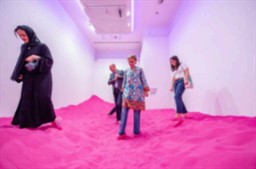〈아랍어로, 쉼표〉는 진분홍과 자홍색 사이의 색조를 띄는 팬톤 213번 염료로 물들인 모래로 공간을 구성하여, 관람객을 분홍빛 사막 풍경으로 이끈다. 이 사막의 색조는 팝 아이콘이나 바비 인형과 같은 장난감, 유방암 인식 캠페인의 이미지를 연상시킨다. 황량한 모래의 세계로 재현된 이 자홍빛 들판은 현실과 동떨어진, 때로는 종말론적 분위기를 띠며, 결함이 생긴 우주나 다른 존재와의 접촉을 떠올리게 하는 오류 사운드가 함께한다. 관람객은 이 가상 풍경 속 ‘지능적 존재’로 설정되어, 분홍 모래를 밟아 이동할 때마다 전자음의 비명과 으르렁거림을 발생시키게 된다. 시간이 흐르며 축적되는 오류음은 디지털 정보에 압도되는 감각을 만들어내고, 작가의 표현처럼 “가상 세계에 과자극된” 상태를 경험하도록 한다. | |
