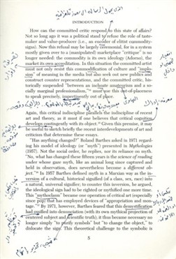 | 비벡 빌라시니(Vivek Vilasini), 〈정독: 일화와 주석〉, 하산 샤리프의 주석을 해석하여 할 포스터의 「미술·스펙터클·문화정치」에 투사한 작업, 2021, 가변 크기. 아부다비 음악예술재단 커미션. 압두라힘 샤리프와 모하메드 샤리프 소장 도서. | ||