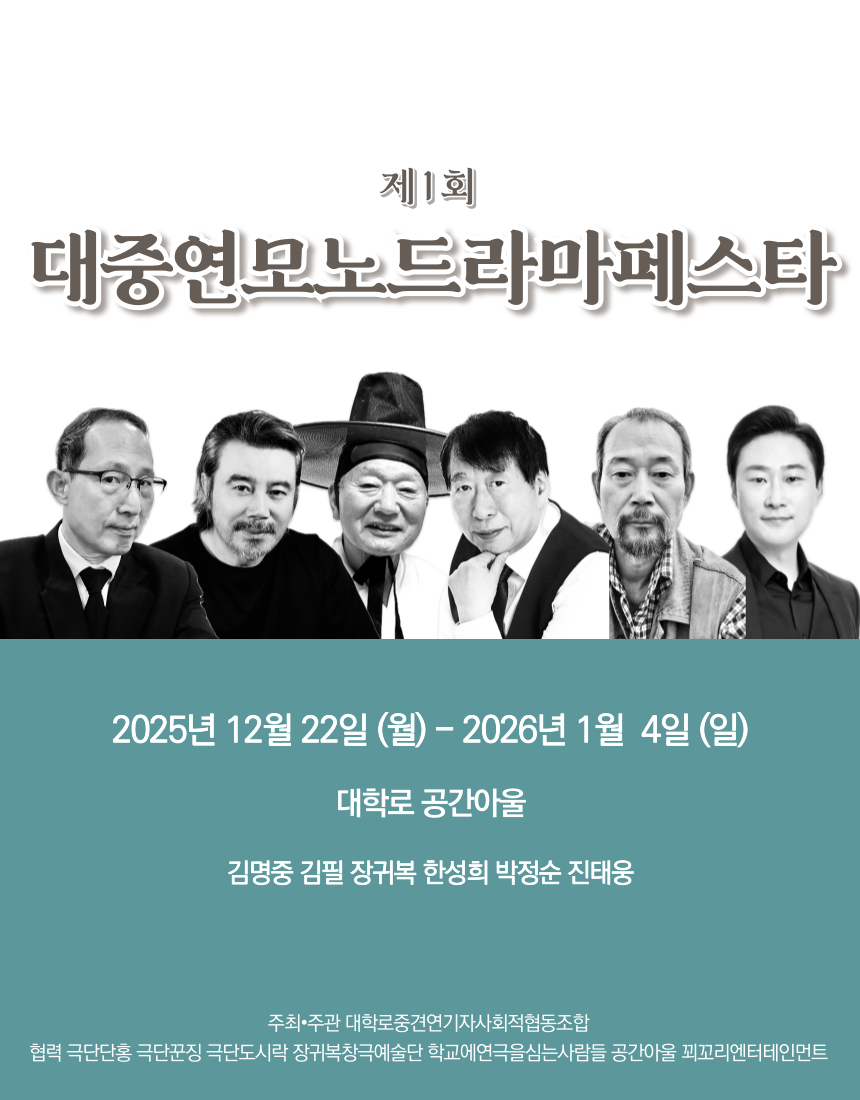 [플레이뉴스 문성식기자] 제1회 대중연모노드라마 페스타는 대학로중견연기자사회적협동조합(대표 곽수정)에서 야심차게 준비한 모노드라마 축제로 총 6편의 다양한 형식의 모노드라마가 선보인다.