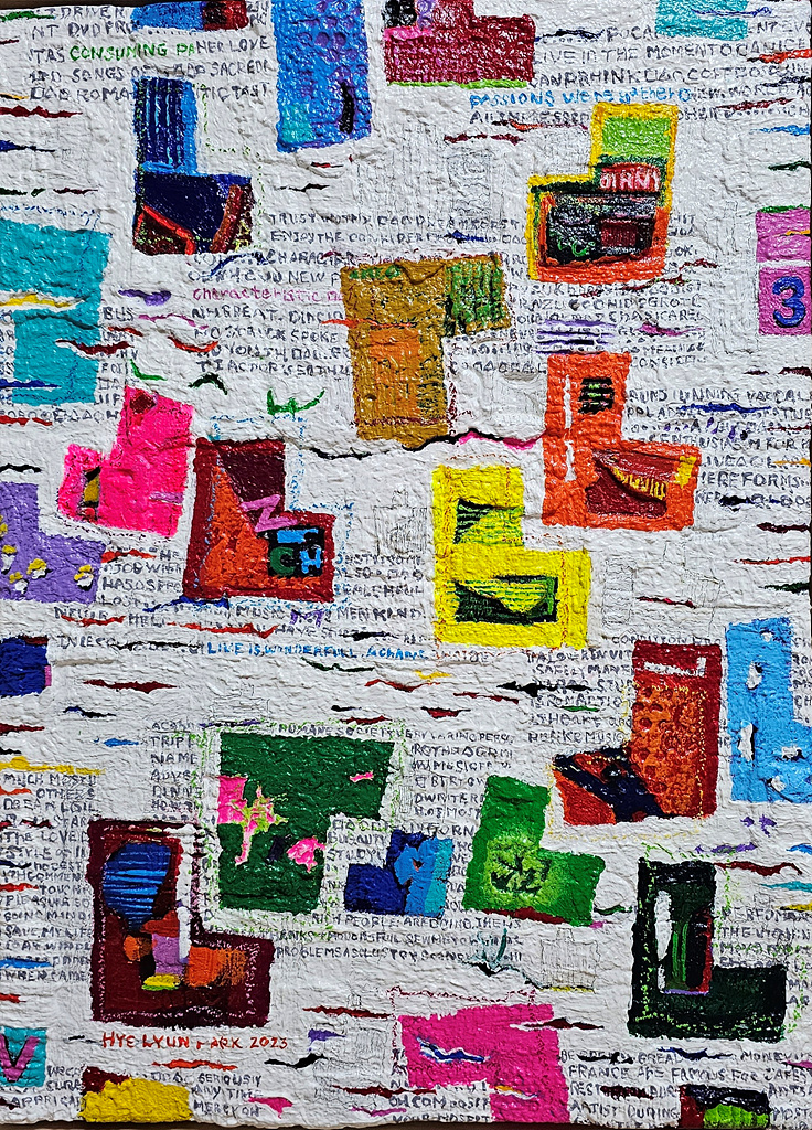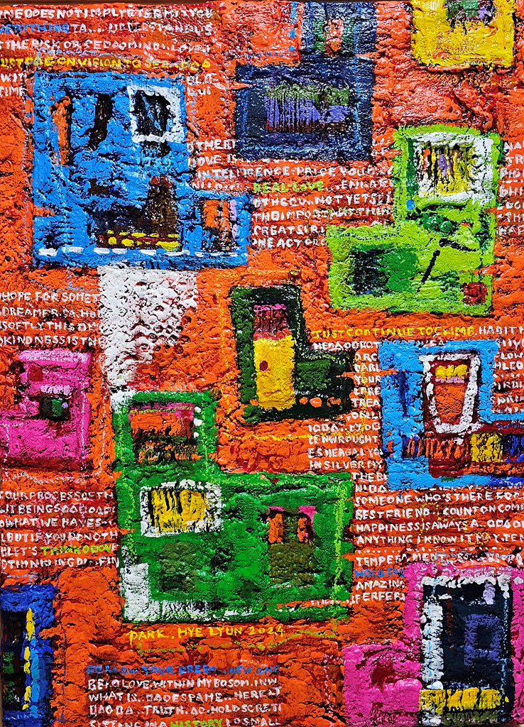 일정한 규격에 맞추듯 생성된 이미지는 추상에 가까운 자유로운 상상력이 동원되었으며, 다채로운 채색은 전달력을 높이는 도구가 된다. 두터운 마티에르 위에 숨겨진 보물처럼 새겨 넣은 문자의 긍정적 구성은 창의성을 돋보이게 한다.