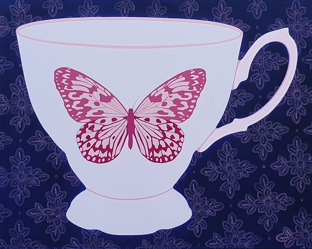 '회상' 작품은 아크릴 재료를 활용하여 화사한 발색이 돋보이는 그림으로 단순한 이미지 속에 담긴 뚜렷하고 분명한 메시지가 인상적이다. 작가에게 컵은 담는 용도를 넘어 삶의 진실함과 평온의 온기가 가득하기를 바라는 심성의 표현이다.