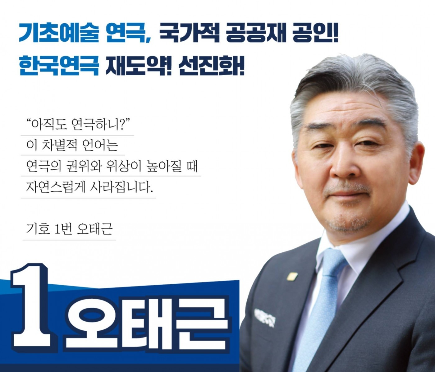 오태근 후보는 (사)한국연극협회 26대 이사장으로 팬데믹 시기 어려운 상황을 극복한 실력자로 평가받아왔으며, 다수의 예술단체장 경력을 가진 정통 예술행정가로서 한국 연극의 정상화와 선진화를 실현할 적임자로 기대를 모으고 있다.