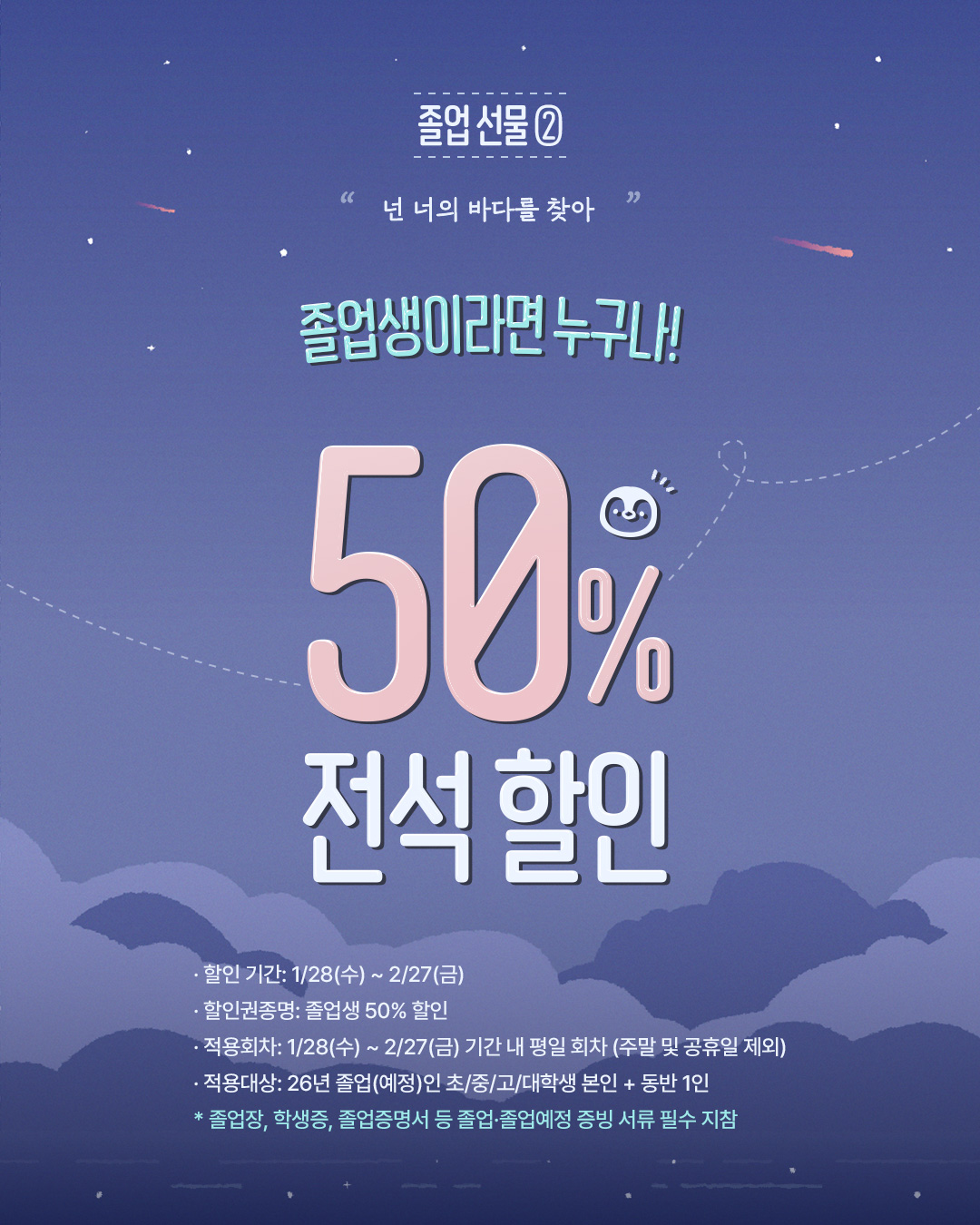 두 번째 졸업 선물은, 모든 졸업생을 대상으로 50% 할인 프로모션을 진행한다. 해당 할인은 졸업생 본인뿐만 아니라 동반 1인까지 동일하게 적용, 친구나 가족과 함께 공연을 관람할 수 있도록 했다. 졸업이라는 전환의 순간을 공연 관람이라는 특별한 경험으로 기념하자는 취지다.