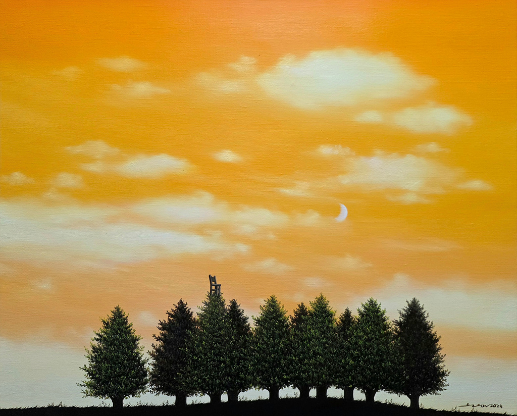 작가는 작품을 통해 관객에게 햇솜같이 하얀 구름이 떠있는 청명한 하늘과 함께 하늘로 솟은 나무들 위에 올려놓은 작은 의자를 바라보며 지나가는 바람과 함께 천천히 흔들려보라고 읊조린다.