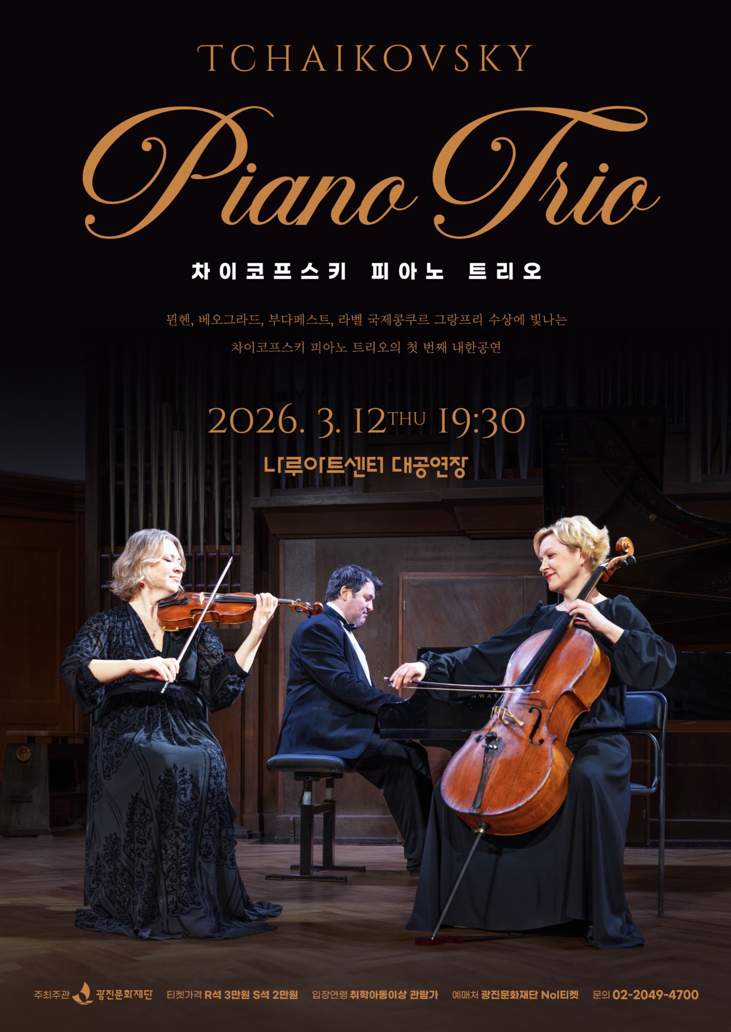 ‣ 공 연 명 : 차이코프스키 피아노 트리오 ‣ 공연일시 : 2026. 3. 12.(목) 19시30분 ‣ 공연장소 : 나루아트센터 대공연장 ‣ 주최/주관 : (재)광진문화재단 ‣ 소요시간 : 110분(인터미션 15분 포함) ‣ 입장연령 : 취학아동 이상 관람가 ‣ 입 장 권 : R석 3만원 / S석 2만원 / 시야방해석 1만원 ‣ 예약문의 : 02-2049-4700 |