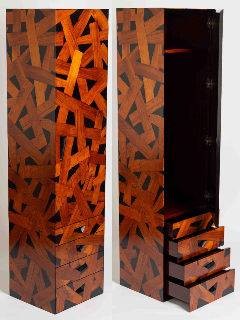 하지만 오랜시간 나전칠기를 해오면서 자개의 화려함은 개인적인 기호에는 맞지 않는다는 것을 느끼게 되었고 오랜 고민 끝에 전통적인 백골의 디자인을 지양함과 동시에 장식물로 나무와 황동을 선택하였다. 문양은 아직 전통문양 중 빙렬문에 의지하였다.