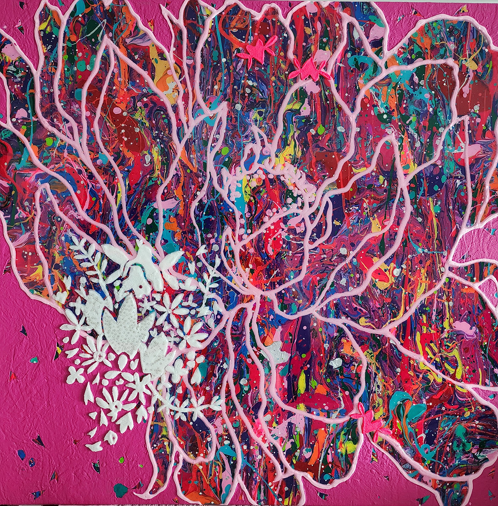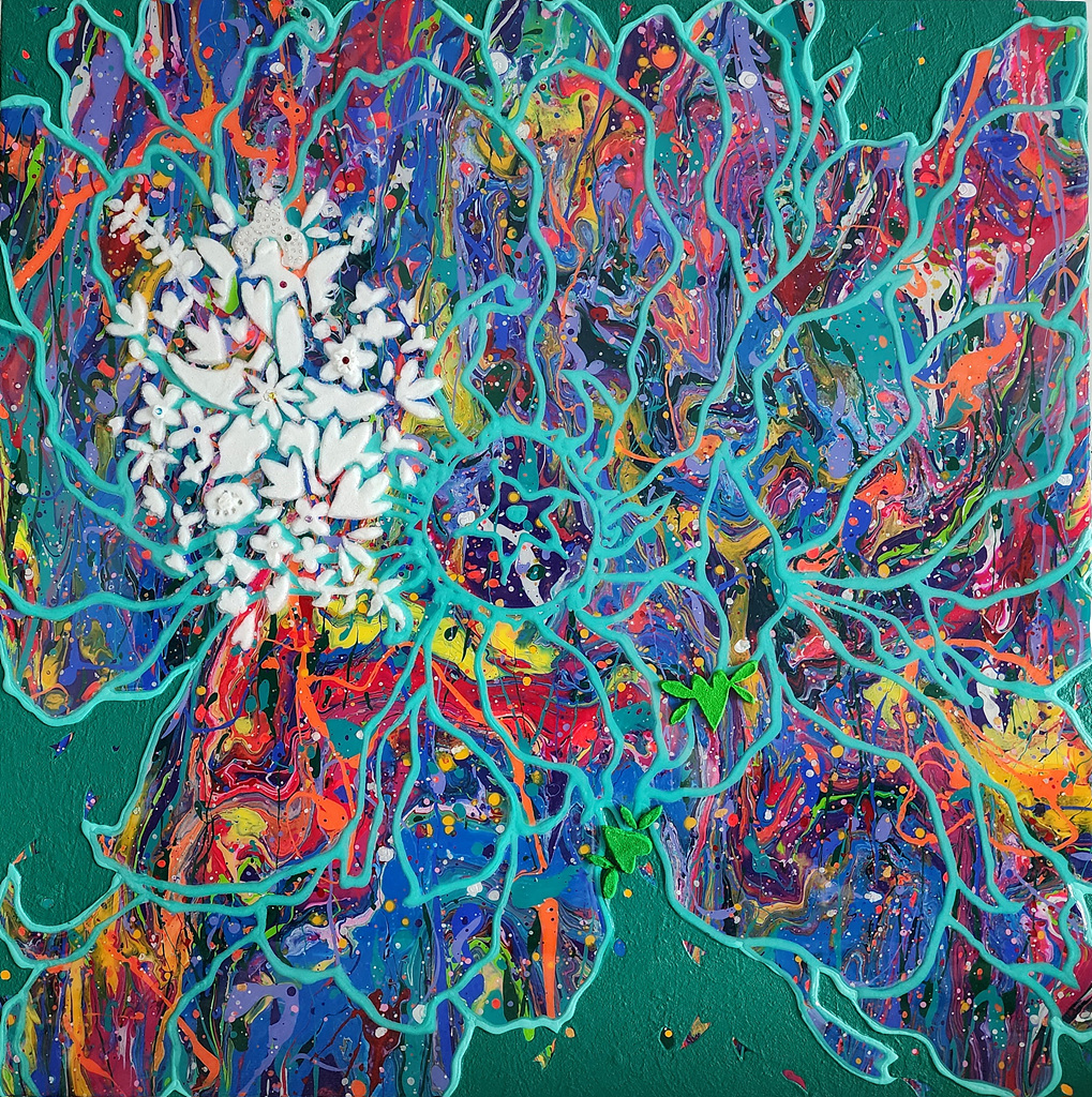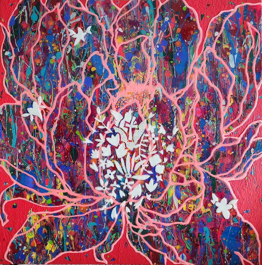 중첩되고 흘러내리는 색채는 자연의 자생적 리듬을 닮았고, 그 위를 감싸듯 이어지는 선은 꽃의 윤곽을 넘어 화면 전체를 유기적으로 연결하는 생명의 맥박처럼 작동한다.