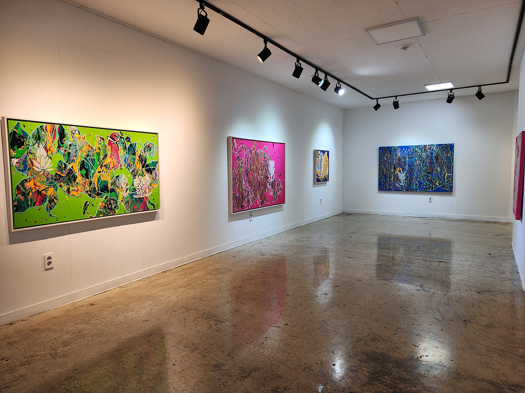 물감을 번지게 하거나 뿌리는 방식으로 표현의 층위를 더하며, 더욱 깊고 빛나는 색채의 세계를 완성하고 있다. 이 연작의 중심에는 꽃이라는 형상이 자리한다.