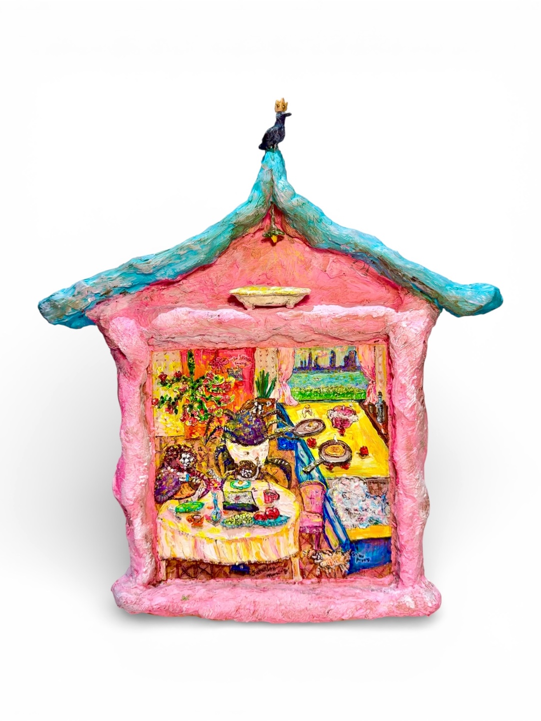 드로잉에서 시작된 선과 덩어리는 재배치되어 콜라주와 얕은 입체 구조를 이루며, 작은 무대처럼 구성되어 표현되며, 연극처럼 연출된 장면들은 생태적 위기와 존재론적 질문을 확장하게 한다. 작가는 강렬한 색채와 반짝이는 장식 요소 속에 삶과 죽음, 불안과 존재의 의미를 재해석한다.