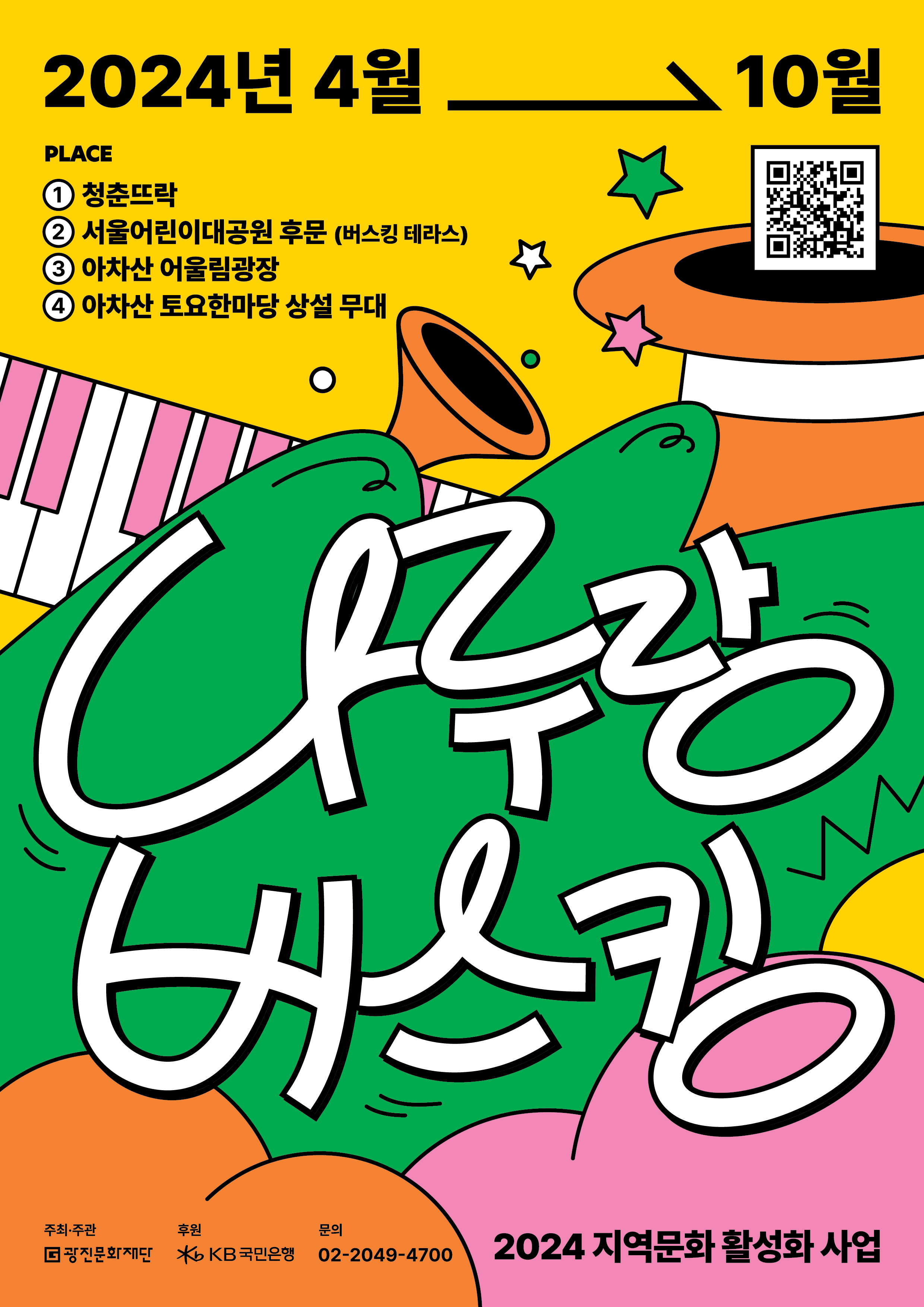 ‣ 행 사 명 : 2024 지역문화 활성화 사업 '나루랑 버스킹' ‣ 행사기간 : 2024. 4. 5(금) ~ 6. 29(토) ※매주 금, 토요일 운영 ‣ 행사시간 : 금요일 18:00 ~ / 토요일 15:00 ~ ‣ 행사장소 - 금요일 : 청춘뜨락 - 토요일 : 청춘뜨락, 서울어린이대공원 후문, 아차산 어울림광장, 아차산 토요한마당 ‣ 주최/주관 : (재)광진문화재단 ‣ 협 업 : 건대프리마켓 ‣ 문 의 : 02-2049-4700 |