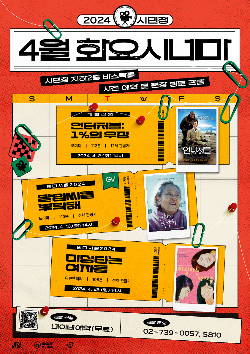 4월 화요시네마에서는 4월 2일 ‘언터쳐블: 1%의 우정’, 4월 16일 ‘말임씨를 부탁해’, 4월 23일 ‘미싱타는 여자들’을 상영한다. 4월 16일 ‘말임씨를 부탁해’ 상영에서는 특별히 박경목 감독을 초청해 관객과의 대화(GV) 시간을 가질 예정이다.