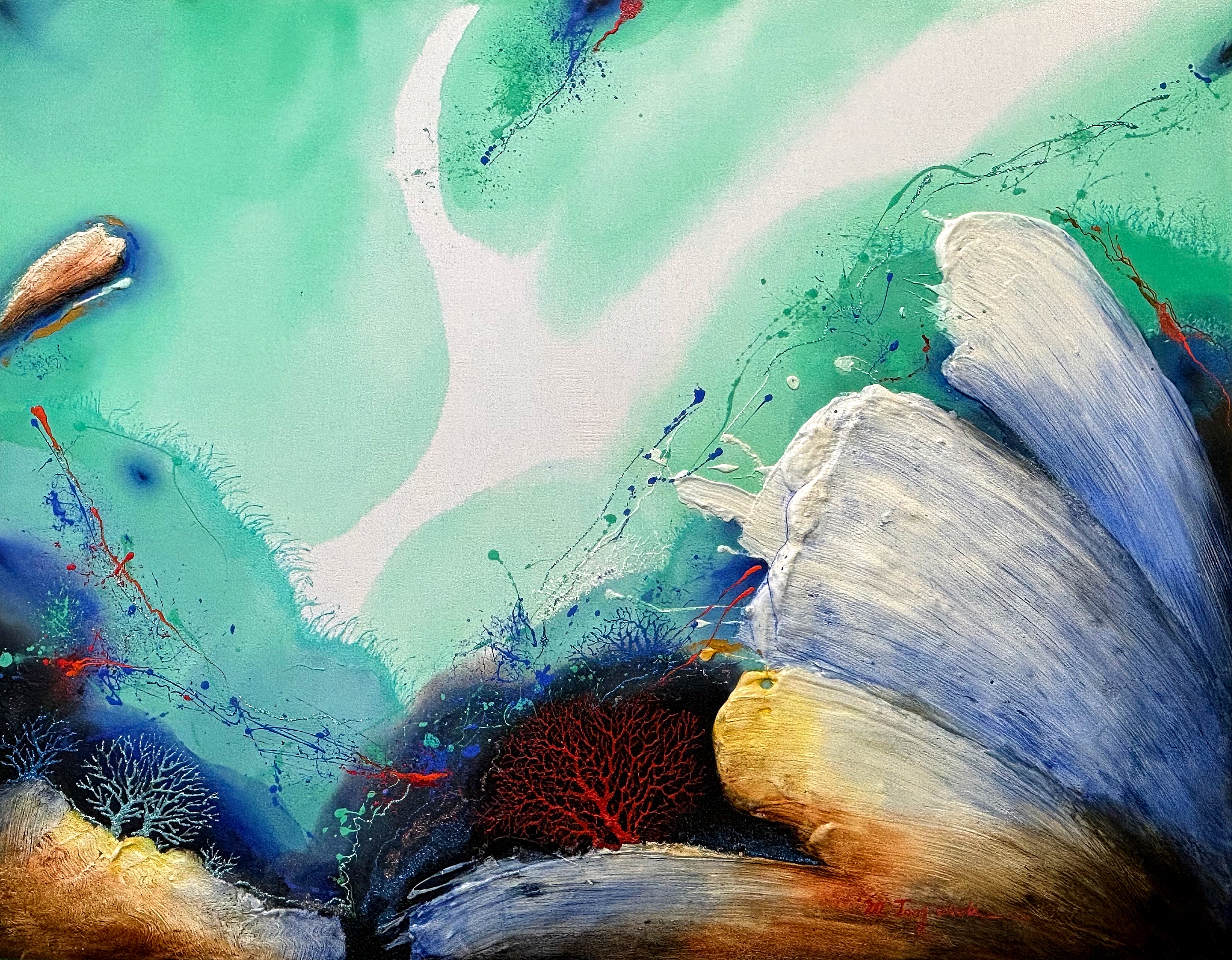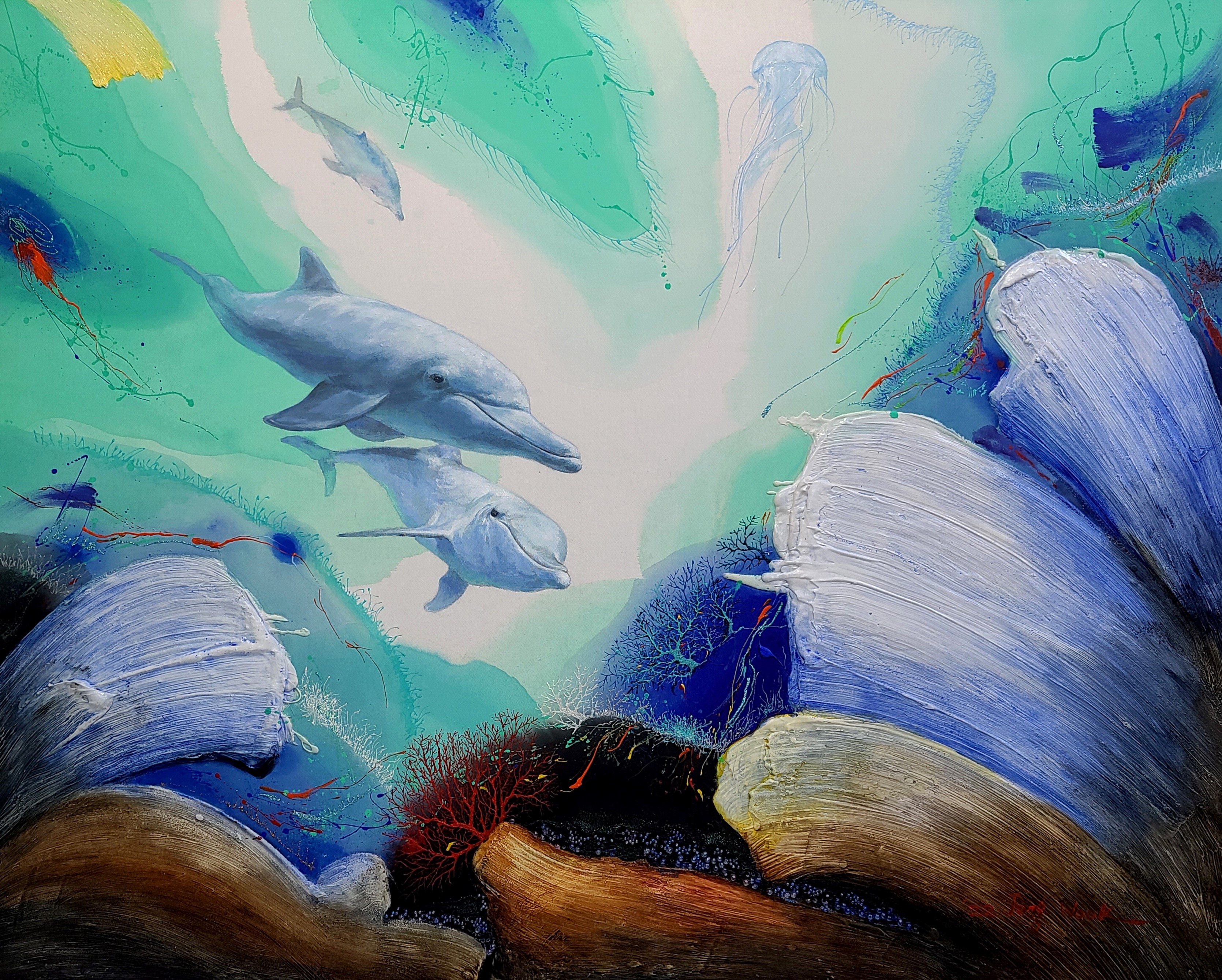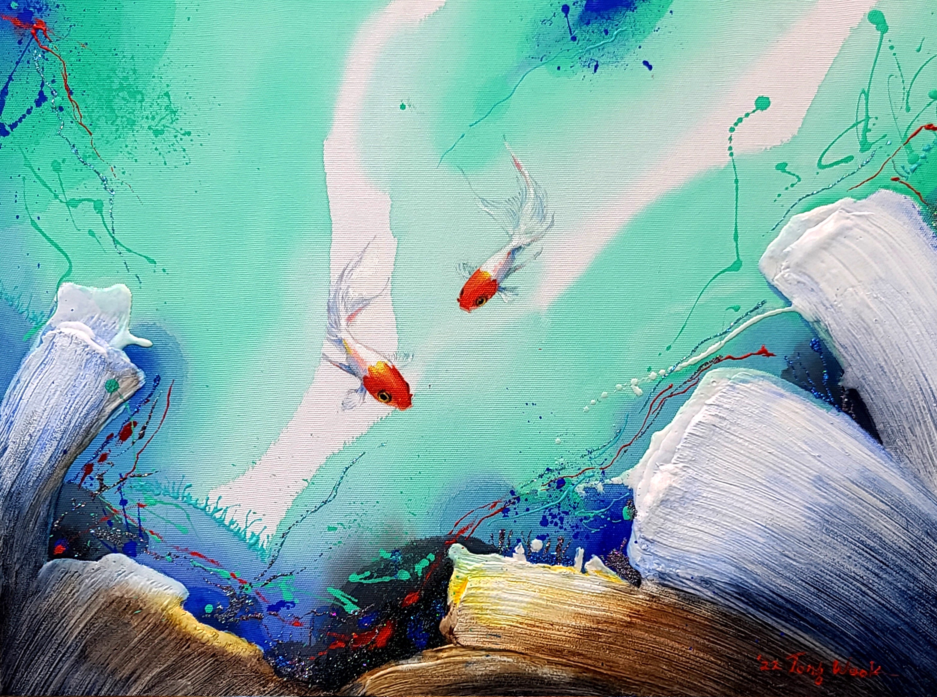 바다를 유유히 헤엄치는 대왕고래를 작품 속에 등장시켰습니다. 고래는 사람들에게 친숙하며 행운, 동경, 동심, 신비로움을 상징하기도 하죠. 이 외에 금붕어, 산호초 등 다채로운 생명체가 그림 속에 등장해 감상의 재미를 더해주고 있다.