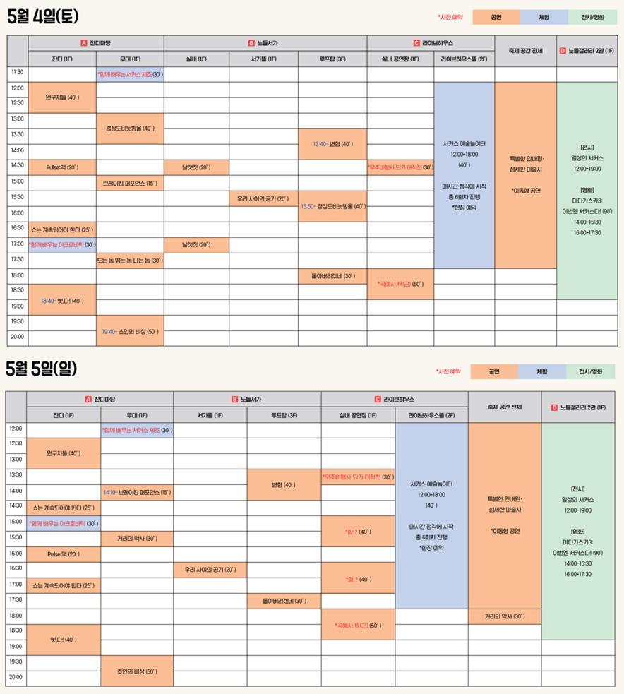 체험프로그램과 함께 사전 예약이 필요한 일부 공연은 오는 24일(수) 오전 11시 네이버 예약을 통해 신청을 접수 받는다. 회차별 참여 인원과 연령제한 등 자세한 정보는 각 프로그램 예매 페이지를 통해 확인할 수 있다.