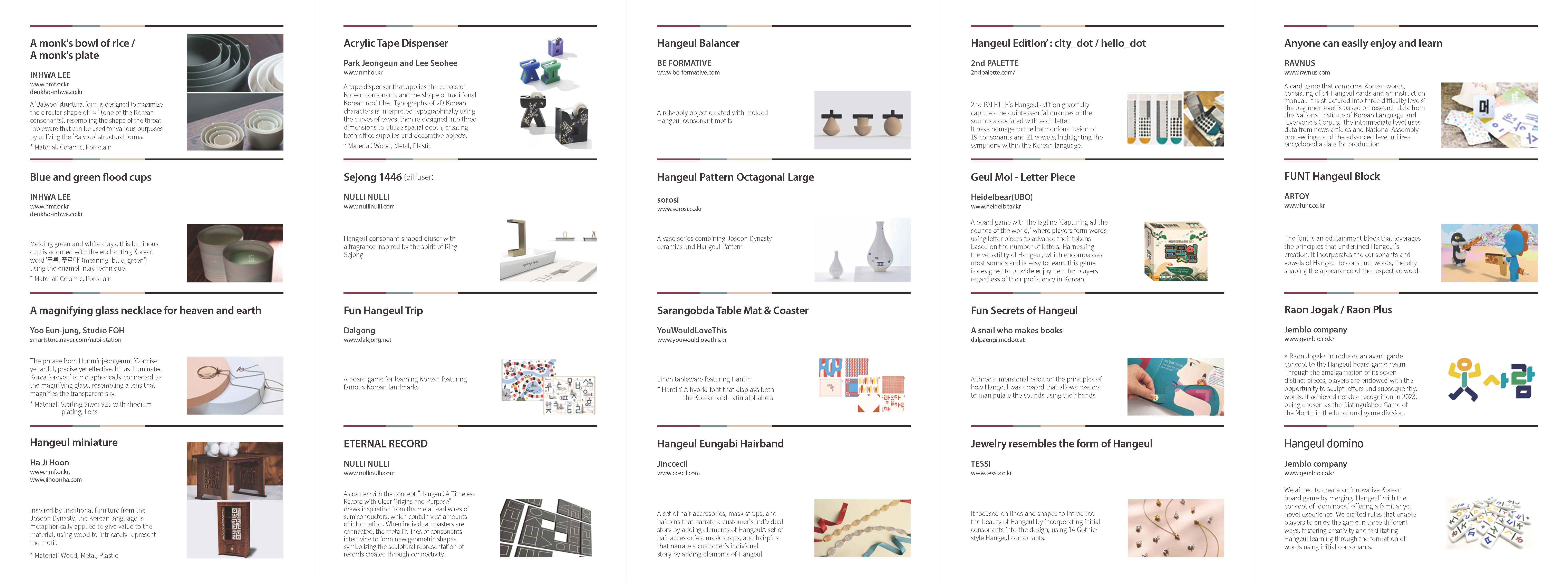 이번 전시에서는 공모전(2019년~2023년)을 통해 발굴된 참신한 한글 문화상품 31종을 선보일 예정이다. 전시 작품으로