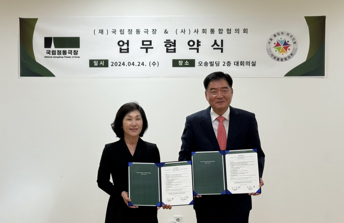 [플레이뉴스 문성식기자] (재)국립정동극장(대표이사 정성숙, 이하 국립정동극장)이 서울출입국 외국인청 (사)사회통합협의회(회장 최기동, 이하 사회통합협의회)와 다문화가정의 공연예술 관람 지원을 위한 업무협약(MOU)을 지난 24일 서울 중구 국립정동극장 사무실에서 체결했다.