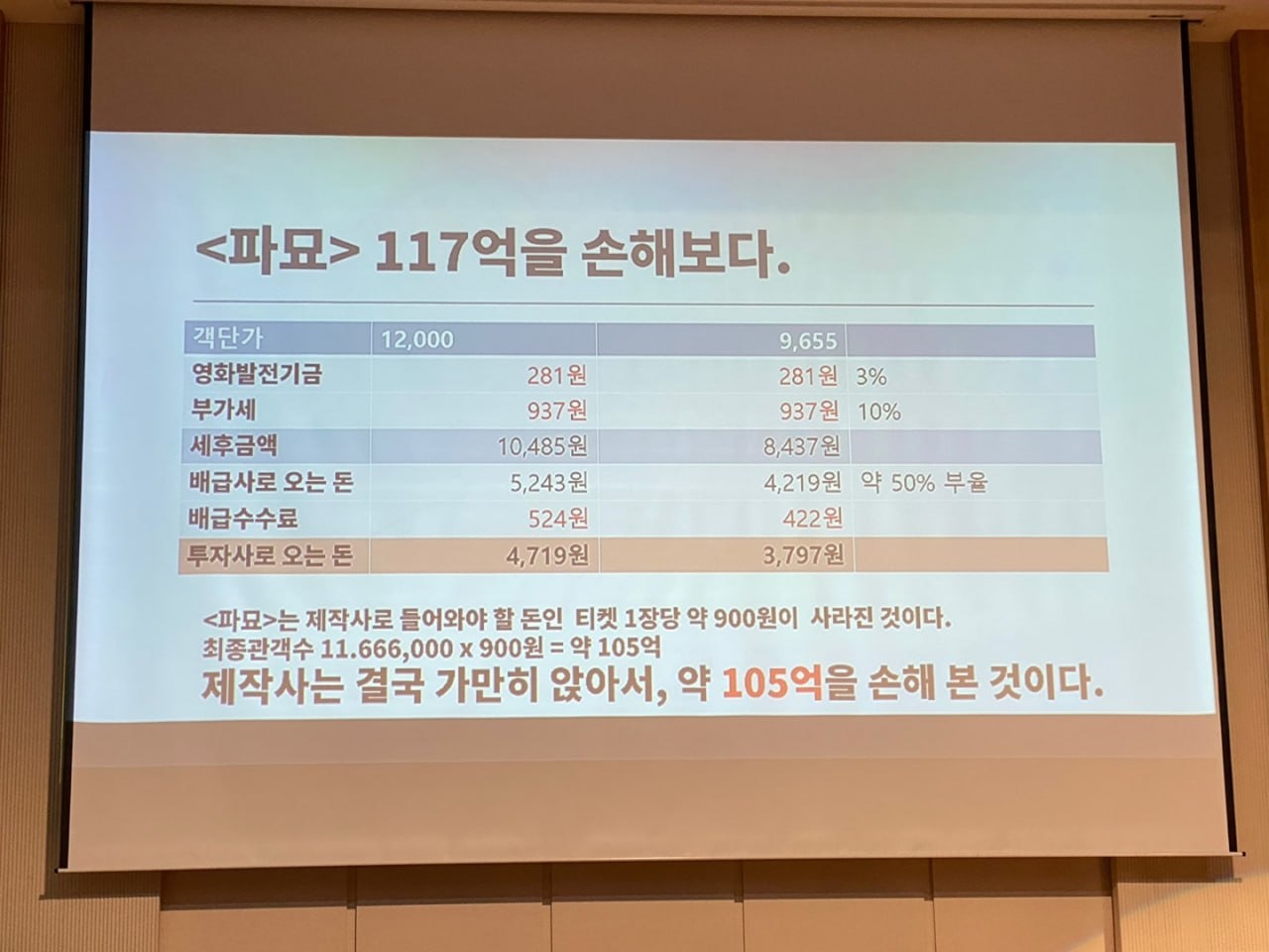“통신사·포인트 차감 등 여러 형태의 할인을 적용하는 과정에 그 부담을 배급·제작사에 떠넘기고 있다”면서 “제작배급사 수익은 줄고 극장 수익만 더 커질 뿐”이라고 지적했다. 일례로 '파묘'의 경우 제작사 손해가 약 105억 원에 달한다고 제시했다.