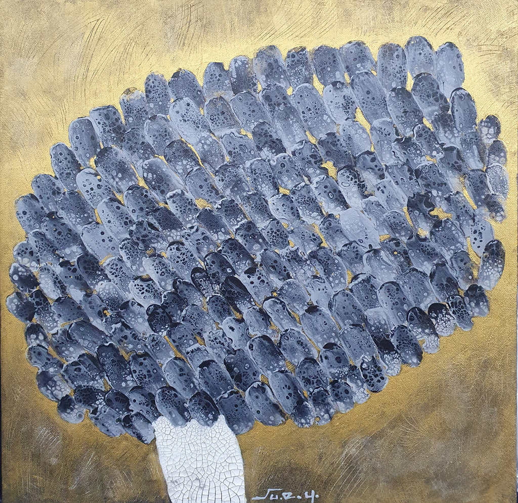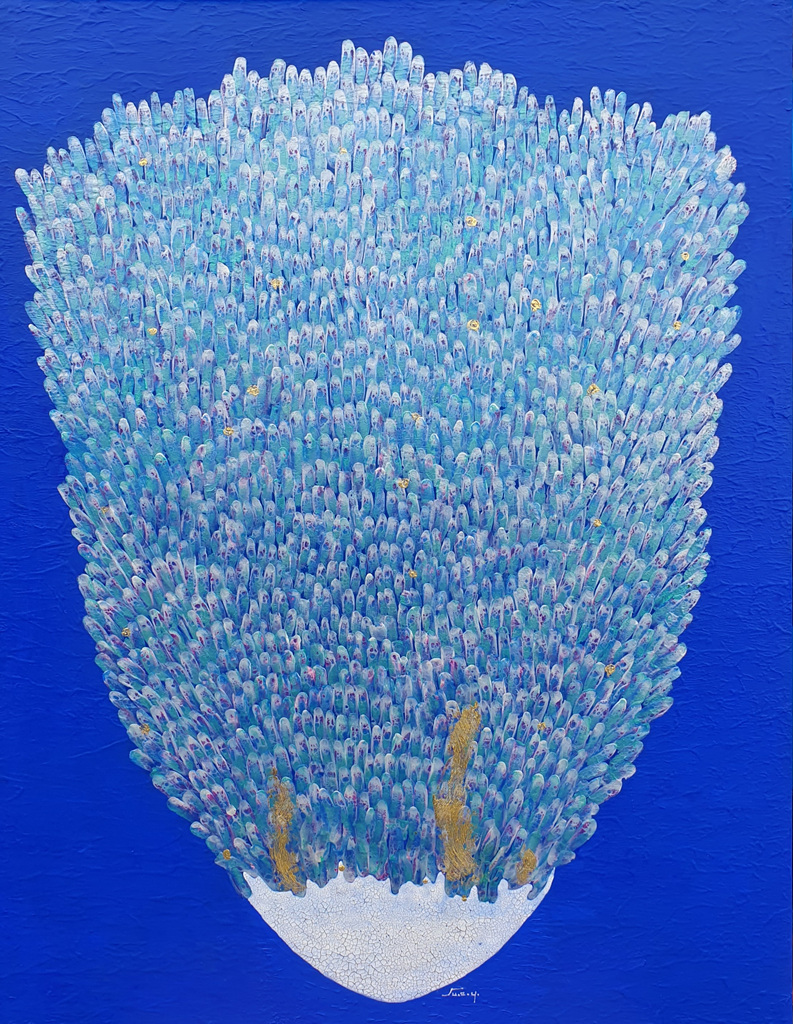 어느 날 힘 풀려 주저앉은 자리에서 문득 고개를 들었을 때 보였던 푸른 하늘을 배경으로 높은 가지들에 매달려 살랑거리며 흔들리던 나뭇잎들이 마치 반갑게 나에게 손짓하는 환영 같았다. 아크릴물감을 이용해 수백 수 천 개의 피스를 만들어 붙인다.