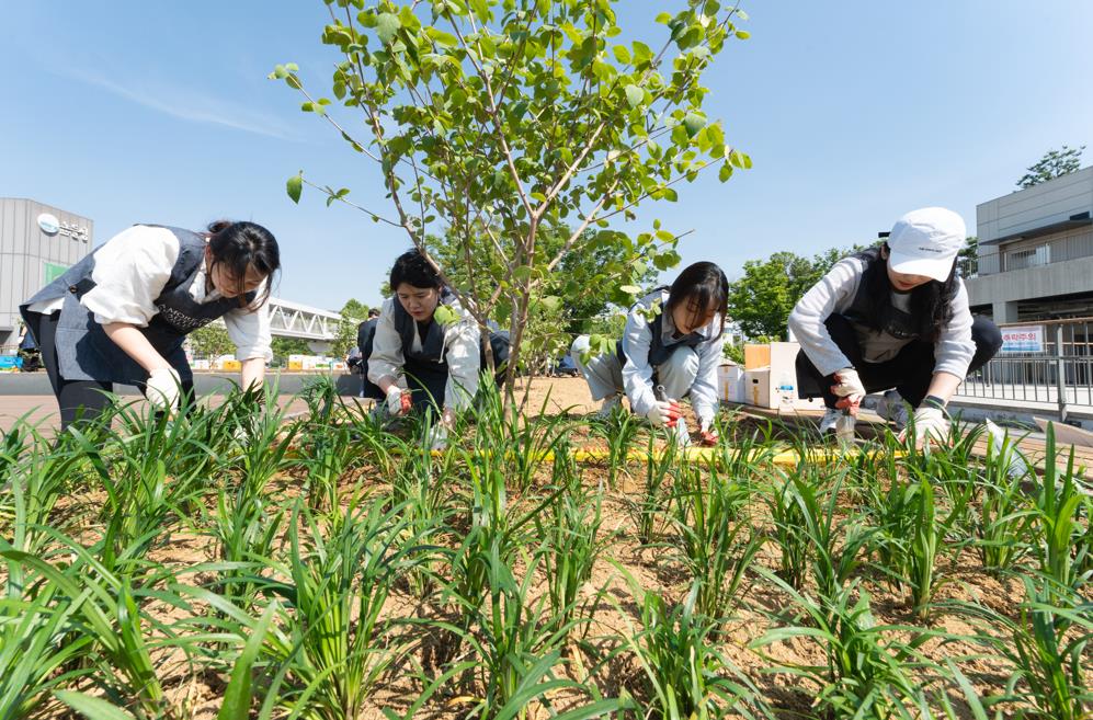 | 사진2. 지난 10일 진행한 아트가드닝 ‘노들섬, 꽃피우다’에서 아모레퍼시픽그룹 구성원과 자원봉사자가 참여해 꽃밭을 조성하고 있는 모습 |