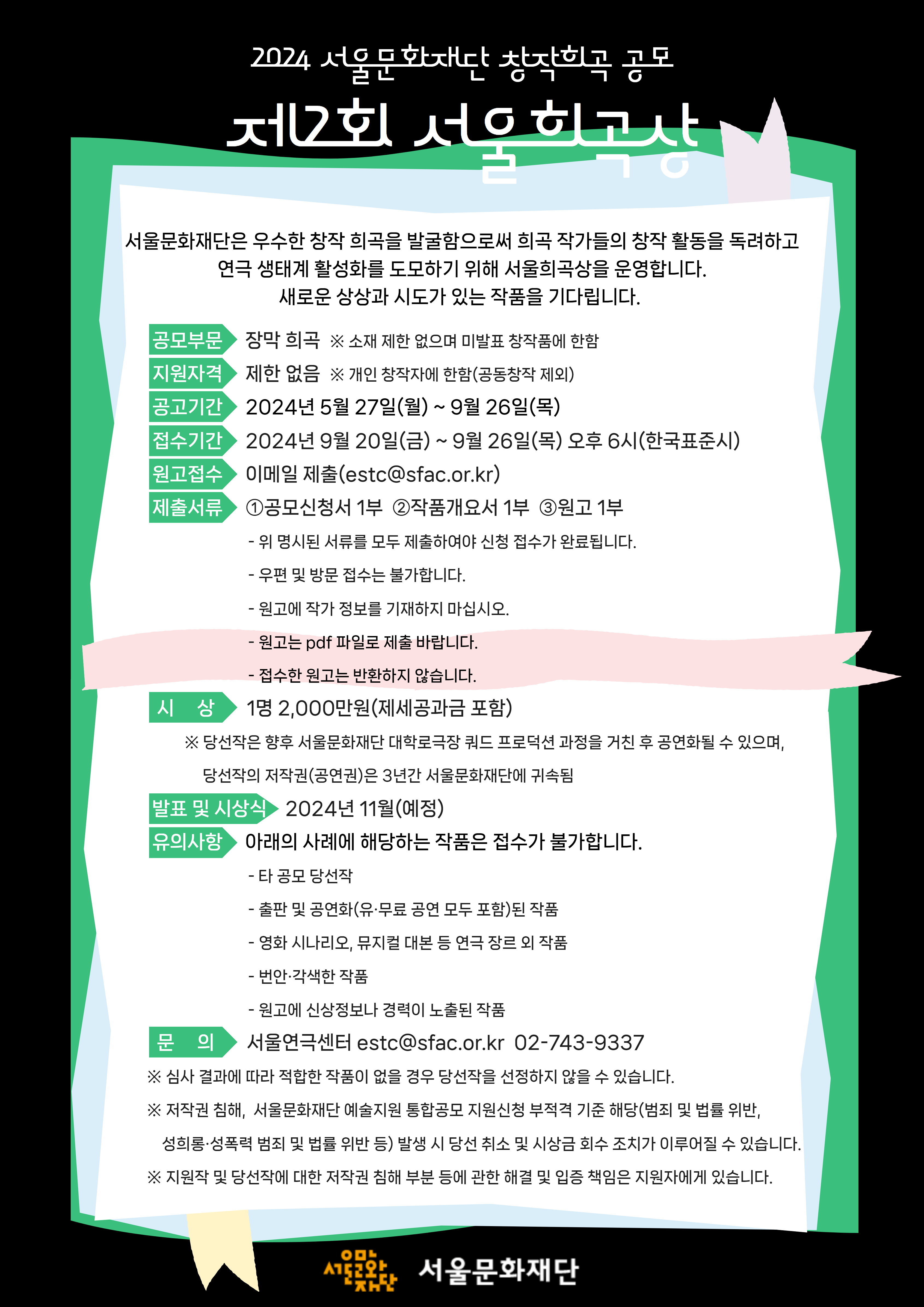 ▶ 서울문화재단, '제2회 서울희곡상' 27일(월) 공고... 9월 26일(목) 지원마감