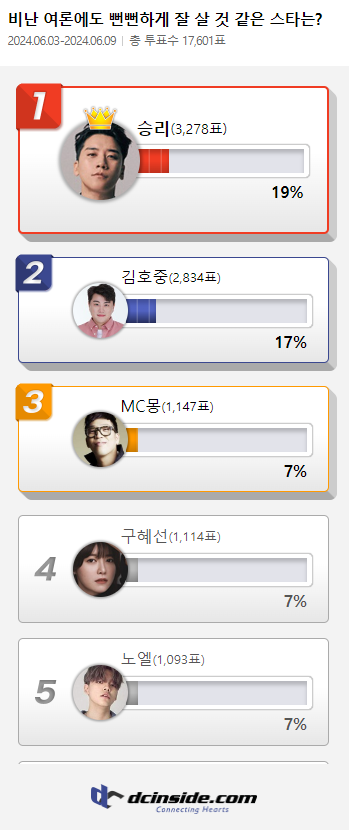 커뮤니티 포털사이트 디시인사이드(대표 김유식)가 `비난 여론에도 뻔뻔하게 잘 살 것 같은 스타는?`으로 투표를 한 결과 승리가 1위에 올랐다. 이 투표는 지난 3일부터 9일까지 총 7일간 진행했다.