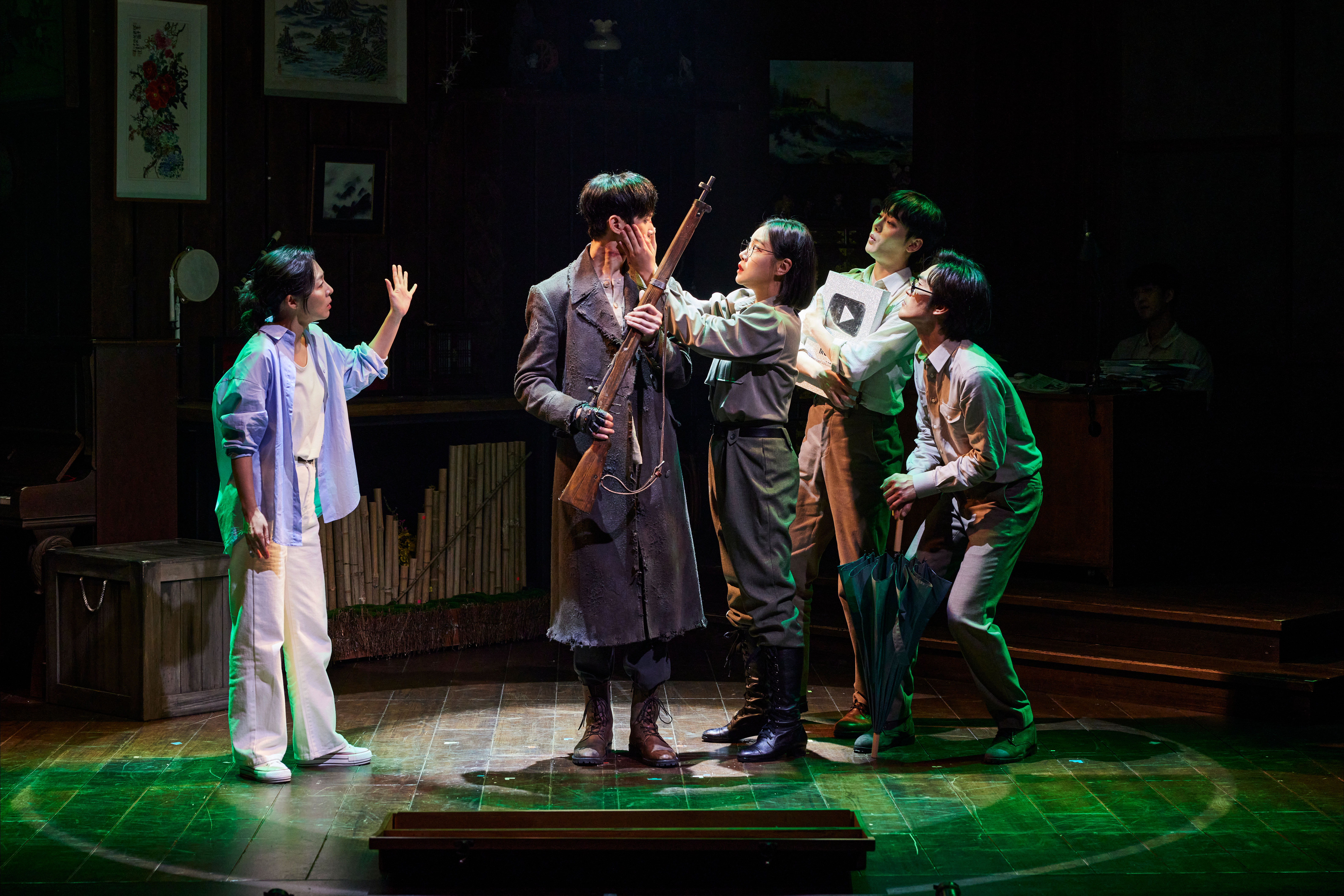 ‘나나’가 ‘빵야’를 찾은 소품 창고를 생생하게 재현한 무대 위에서 관동군 군가, 팔로군 군가, 경비대 군가, 청년단 단가, ‘전우야 잘 자라’, ‘의용대의 노래’. ‘적기가’, ‘오빠는 풍각쟁이’ 등 역사 속 등장하는 군가와 민찬홍 작곡가의 다양한 음악이 어우러져 음악성을 살리고 그에 맞춰 배우들이 선보이는 절도있는 군무는 관객들로 하여금 170분이라는 러닝 타임 동안 긴장을 유지하며 공연에 빠져들게 만든다.