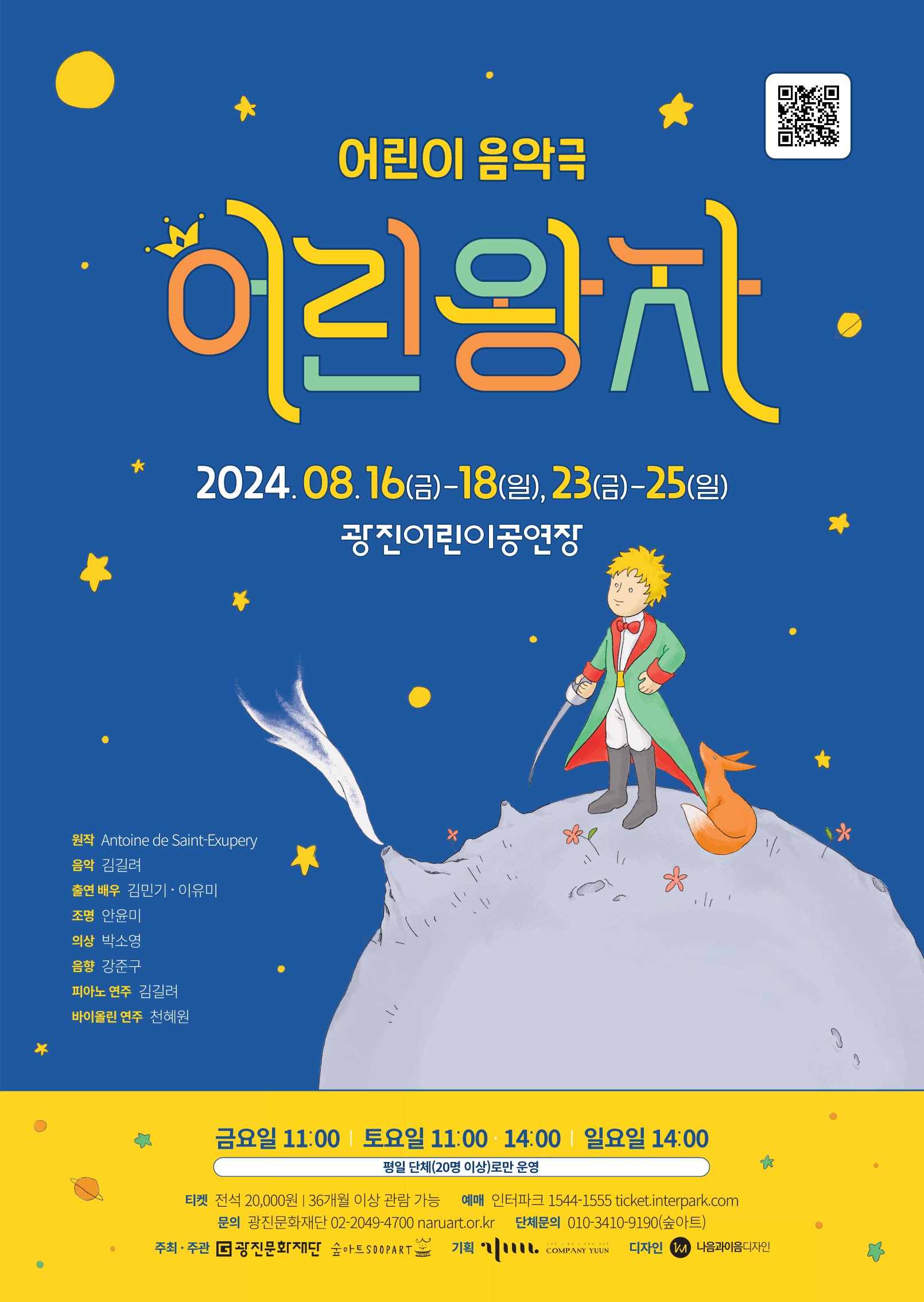 ‣ 공 연 명 : 어린이음악극 <어린왕자> ‣ 공연일시 : 2024. 8. 16(금) ~ 18(일), 23(금) ~ 25(일) ※금요일 11:00: 어린이집/유치원 단체 대상 ※토요일 11:00/14:00, 일요일 14:00: 일반 관객 대상 ‣ 공연장소 : 광진어린이공연장 ‣ 주최/주관 : (재)광진문화재단, 숲아트 ‣ 소요시간 : 50분 ‣ 입장연령 : 36개월 이상 ‣ 입 장 권 : 전석 20,000원 ‣ 예약문의 : 광진문화재단 02-2049-4700 |