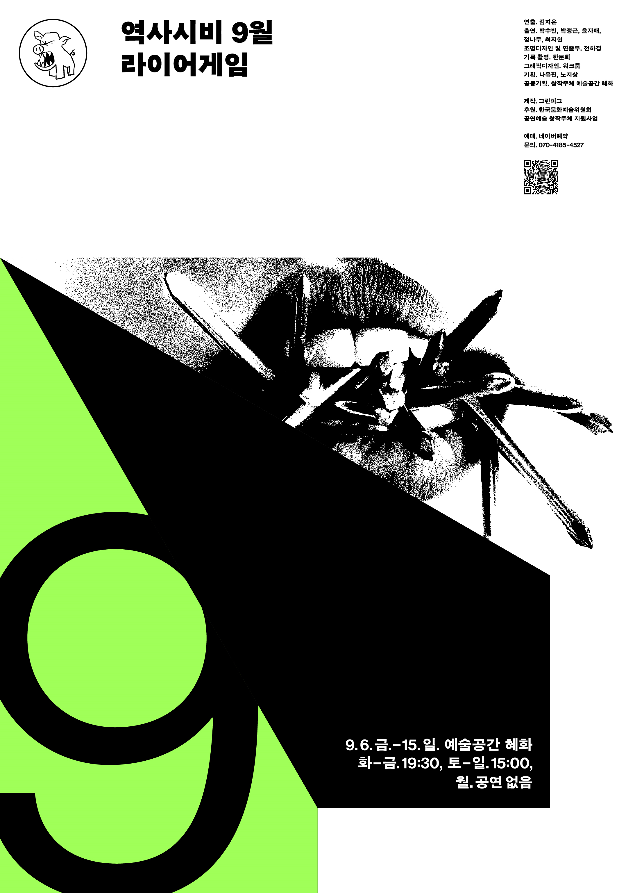 그린피그 연출부. 우리가 살고 있는 세계를 구성하고 있는 것들에 대한 관심을 바탕으로 사건에 비추어 사회를 살펴보는 작업을 이어가고 있다. - <귀신-굿>(2023), <악연-스무 번째 생일 소원>(2022), <꽃피는 정거장>(2022) |