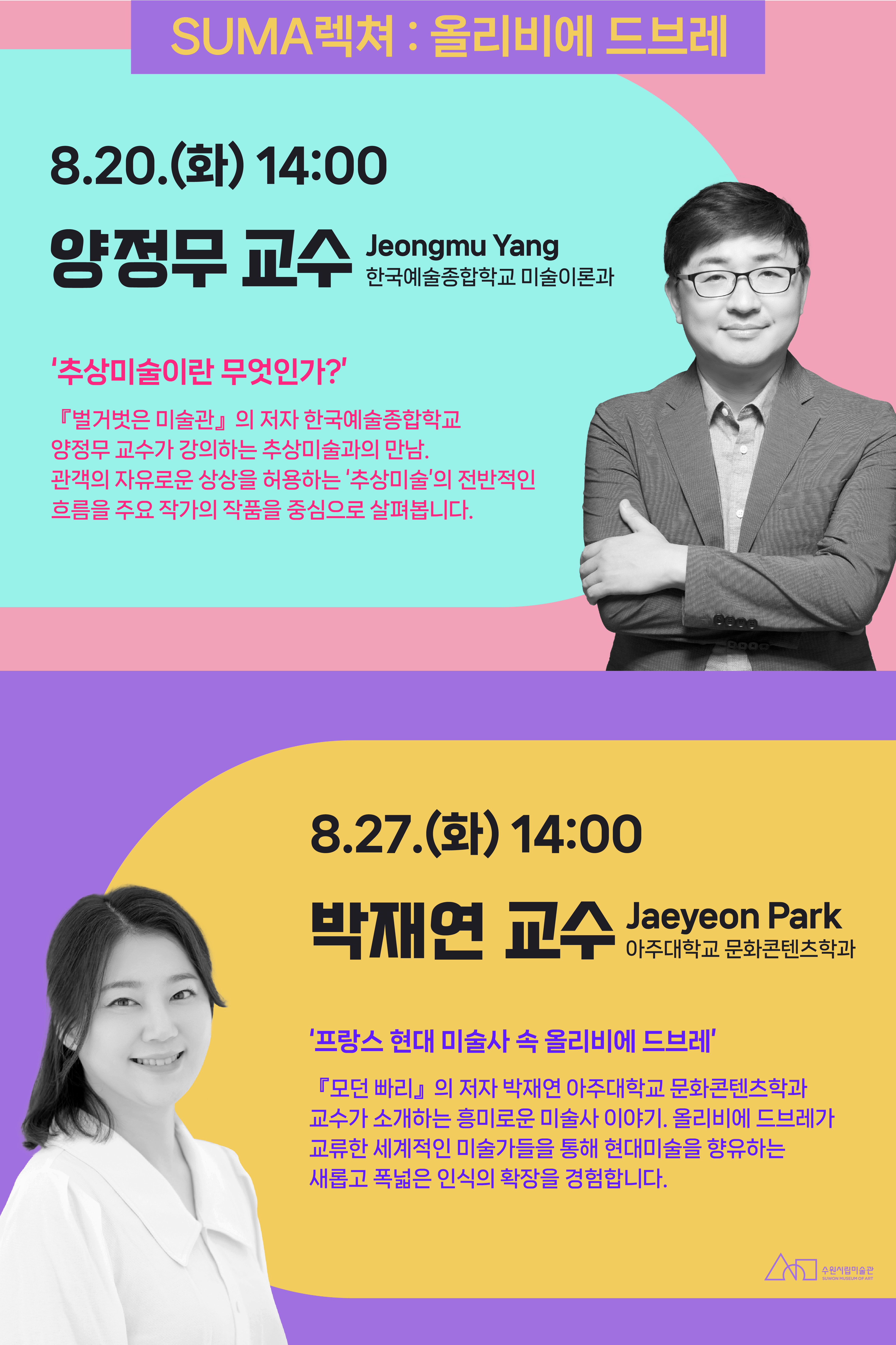 [플레이뉴스 문성식기자] 경기도 수원시립미술관(관장 홍건표)은 2024 전시 연계 인문학 강좌 'SUMA 렉쳐: 올리비에 드브레와 추상미술'을 8월 20일(화)과 27일(화)에 개최한다.