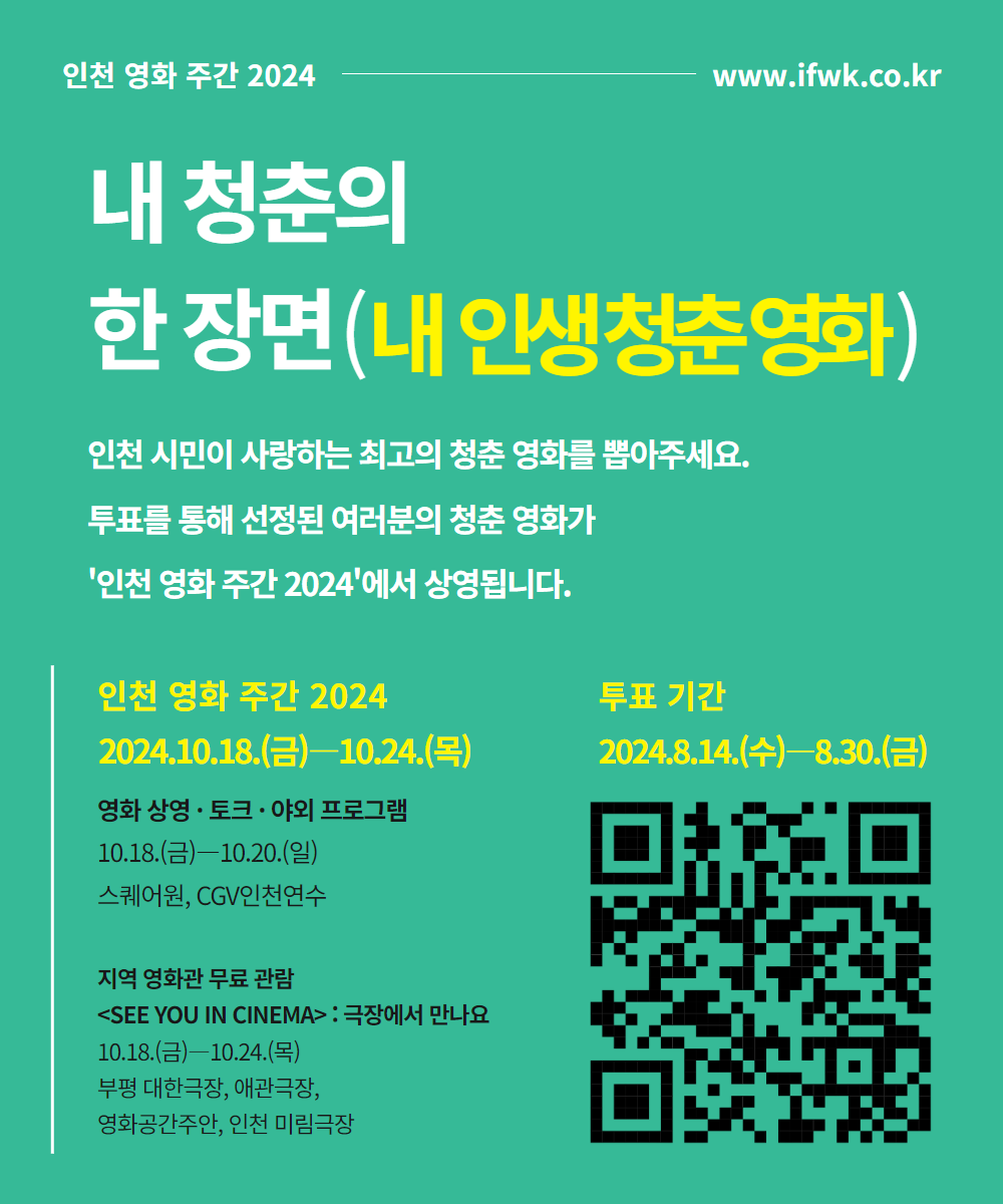 이와 함께 8월 14일()부터 30일(금)까지 인천 영화 주간 공식 홈페이지를 통해 인천 시민이 뽑은 인생 청춘 영화에 대한 투표도 진행하며, 최다 득표를 얻은 작품은 인천 영화 주간 2024에서 공식 상영된다.