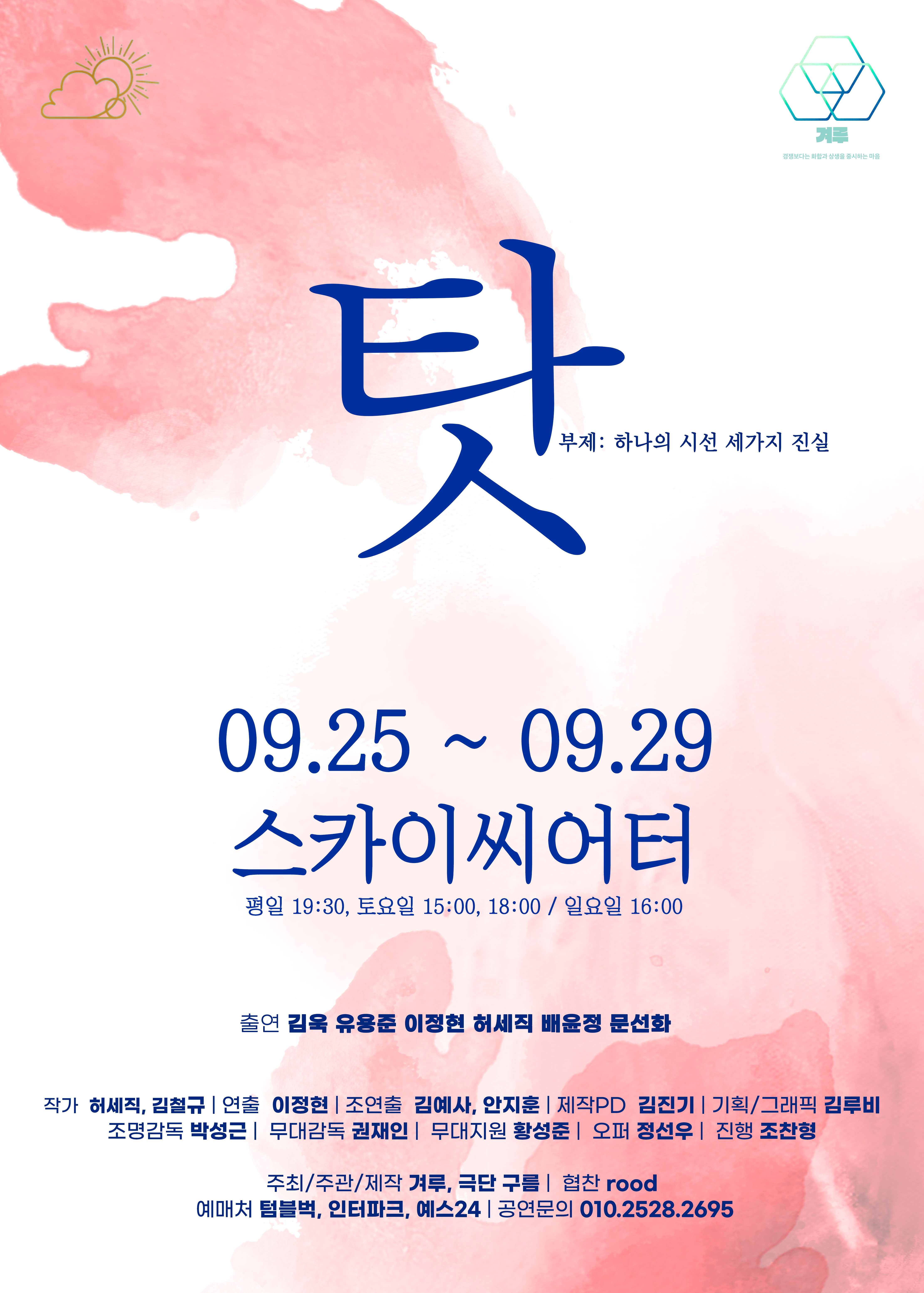 연극 '탓'은 신생 집단 겨루와 연극 활동을 활발하게 하고 있는 극단 구름의 콜라보로 그들의 행보가 기대 되는 연극이다.