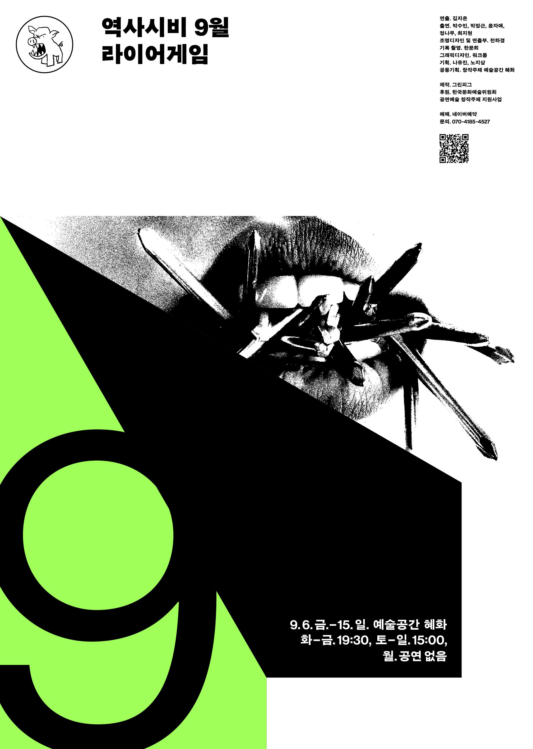 역사시비 '라이어게임'은 9월 6일(금)부터 15일(일)까지 화-금 저녁 7시 30분, 주말 오후 3시에 공연하며, 네이버 예약 및 인터파크 티켓을 통해 예매할 수 있다.