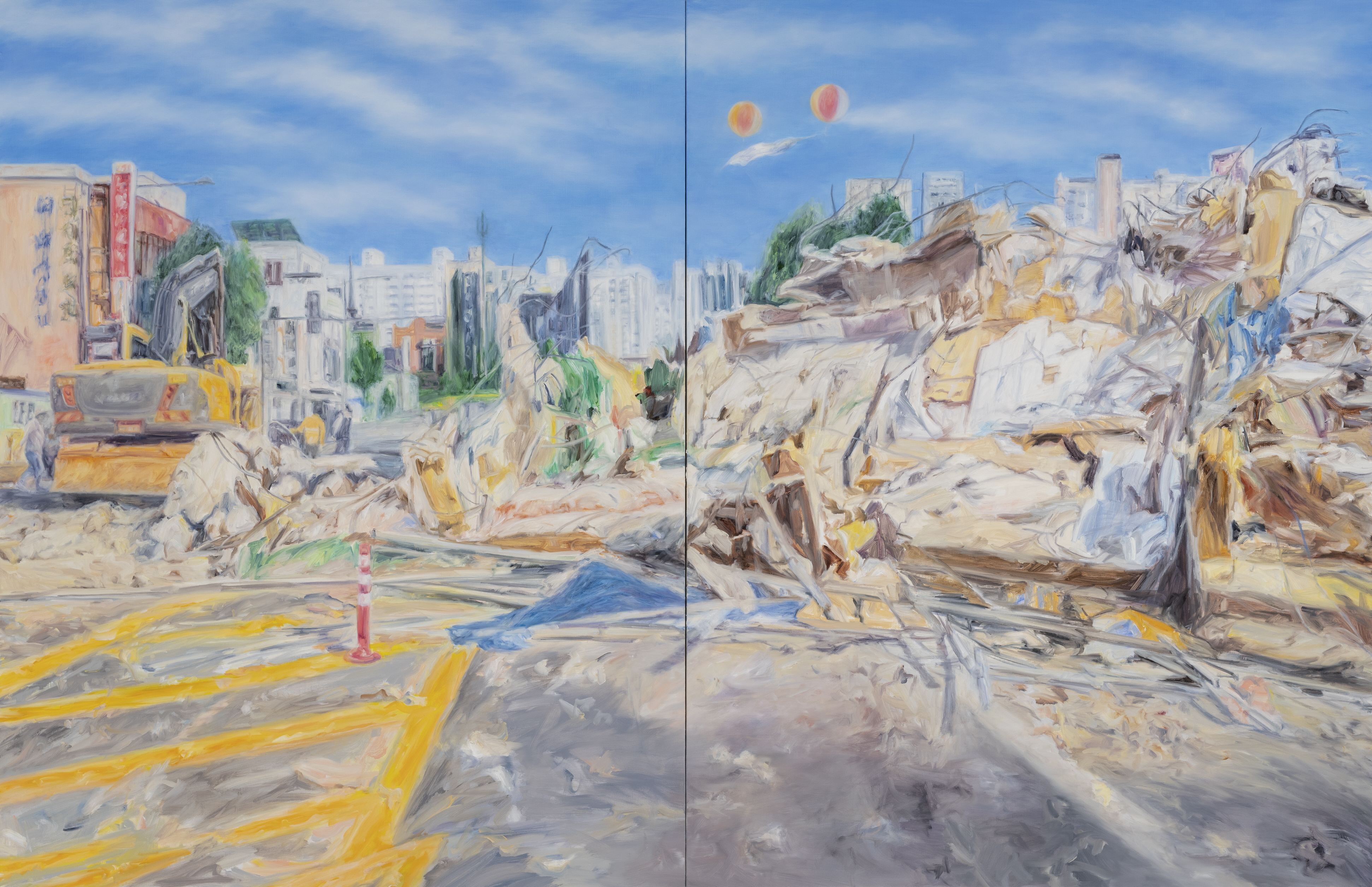 최은경(b. 1970)은 ‘그림’이란 우리 삶의 유형 속에 유형화되지 않은, 꿈의 판타지, 무의식 속에 내재되어 있는 회복에 대한 새로운 열망의 예감, 즉 구체적 꿈꾸기를 마치 그리움(nostalgia)을 그리워하듯 그리기의 ‘붓질’로 가시화하는 것이라 여기며 작업을 전개하고 있다. 작가는 지난 몇 해 동안 여러 지역의 레지던시 입주작가로 활동하며 정주민도 여행자도 아닌 입장에서 풍경과 사물을 목도해왔다. 작가가 바라본 지방 소도시 외곽의 풍경은 우리가 통념적으로 인식하는 풍경의 카테고리 밖에 있는 비(非)풍경적 요소들로 이루어져 있다는 측면에 관심을 가지고 작업했다. 최근에는 보편적 정서로 보통의 삶을 살아가는 이들이 일상을 영위하면서 보거나, 봄직한 삶의 정경이나 풍경에 관심을 가지고 작업하고 있다. | 발길 따라 유유히 1 | ![]() |