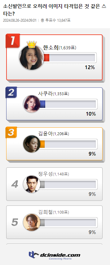커뮤니티 포털사이트 디시인사이드(대표 김유식)가 `소신발언으로 오히려 이미지 타격입은 것 같은 스타는?`으로 투표를 한 결과 한소희가 1위에 올랐다. 이 투표는 8월 26일부터 9월 1일까지 총 7일간 진행했다.