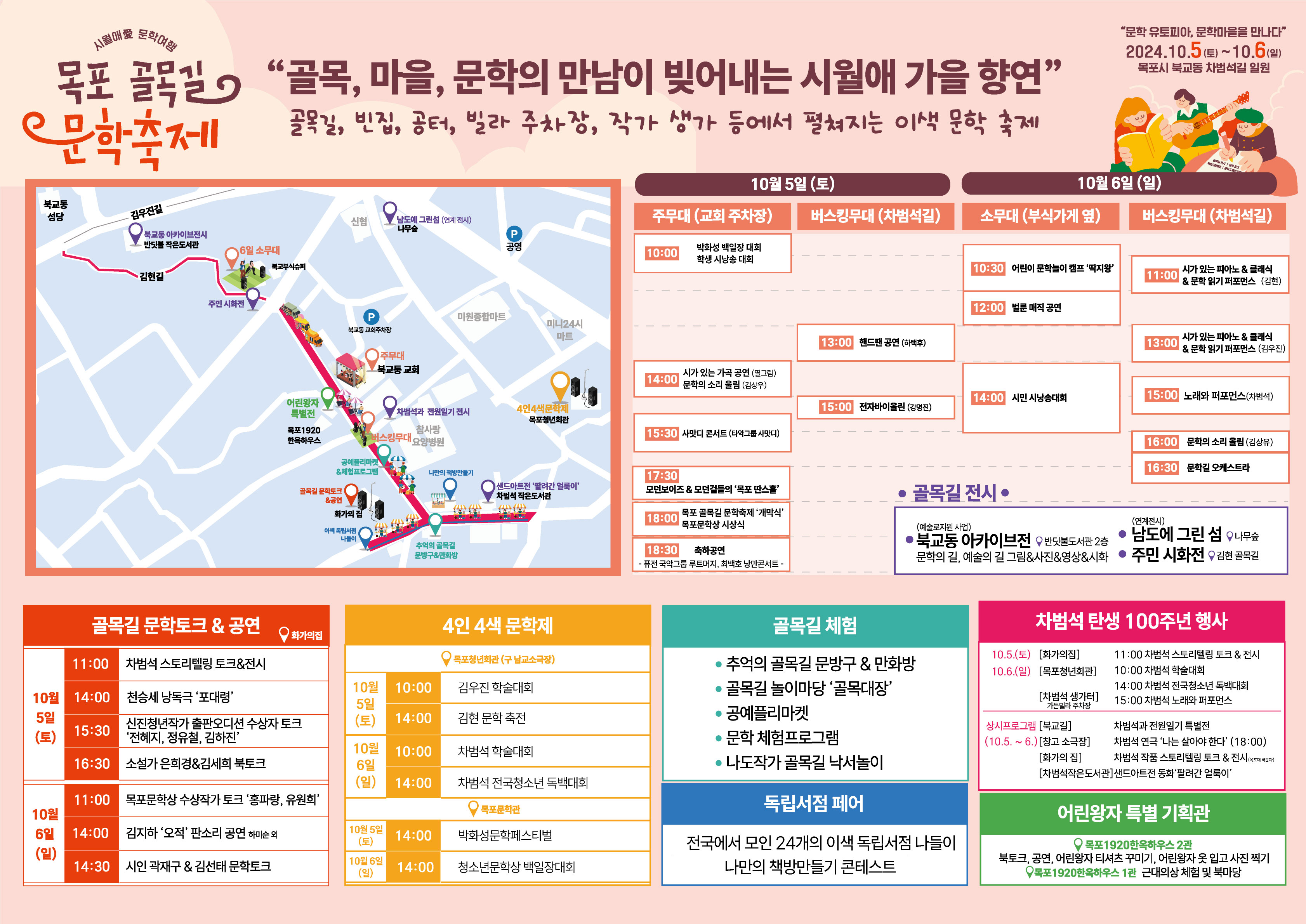 시월애 문학여행 목포 골목길 문학축제는‘문학, 유토피아 문학마을을 만나다’라는 테마로 개최된다. 이번 행사에서는 개막식, 골목길 문학 전시, 공연, 체험 및 독립서점 페어, 차범석 탄생 100주년 행사 등 다양한 문학 관련 프로그램이 진행된다.